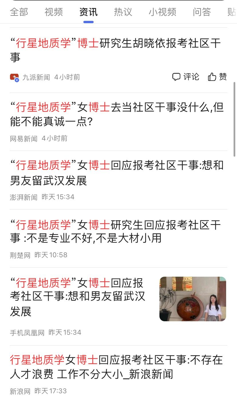 这两天,“行星地质学女博士胡晓依报考社区干事”热度不减。