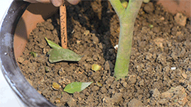 第一点是由于盆土过干,如何在家里判断盆土的干和湿呢?拿根一次性筷子,插入土中3-5公分,然后再拔出来,如果筷子上面全部是干的,那证明就要浇水了。