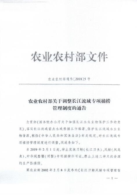 为贯彻《国务院办公厅关于加强长江水生生物保护工作的意见》,落实长江流域重点水域禁捕工作部署,保护长江流域水生生物资源,根据《中华人民共和国渔业法》有关规定,对长江流域专项捕捞管理制度进行调整,现通告如下。