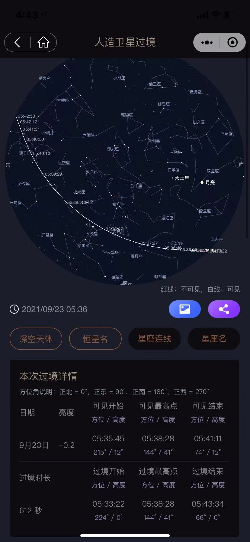 这些观测数据包括亮度、可见开始的方位和高度及可见结束的方位和高度等等。其中,高度较高、亮度较亮、观测条件较好的过境日期,前方会有“荐”字图标。在过境详情的页面中,上方是过境时的经天图(星图和过境时的轨迹),观测者可以形象直观地看到空间站是如何从星空中划过,以及到达某个位置的具体时间。