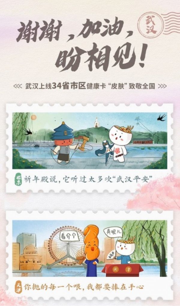 武汉市卫生健康委员会联合腾讯、湖北省楚天云,向全国人民送出34张电子健康卡“盲盒皮肤”,致谢每一个在抗击疫情中给予过武汉帮助、努力坚守、勇敢担当的人,并在中秋之际向全国人民送上健康和团圆的美好祝愿。用户可在微信搜索健康武汉官微或者腾讯健康,点击领取。