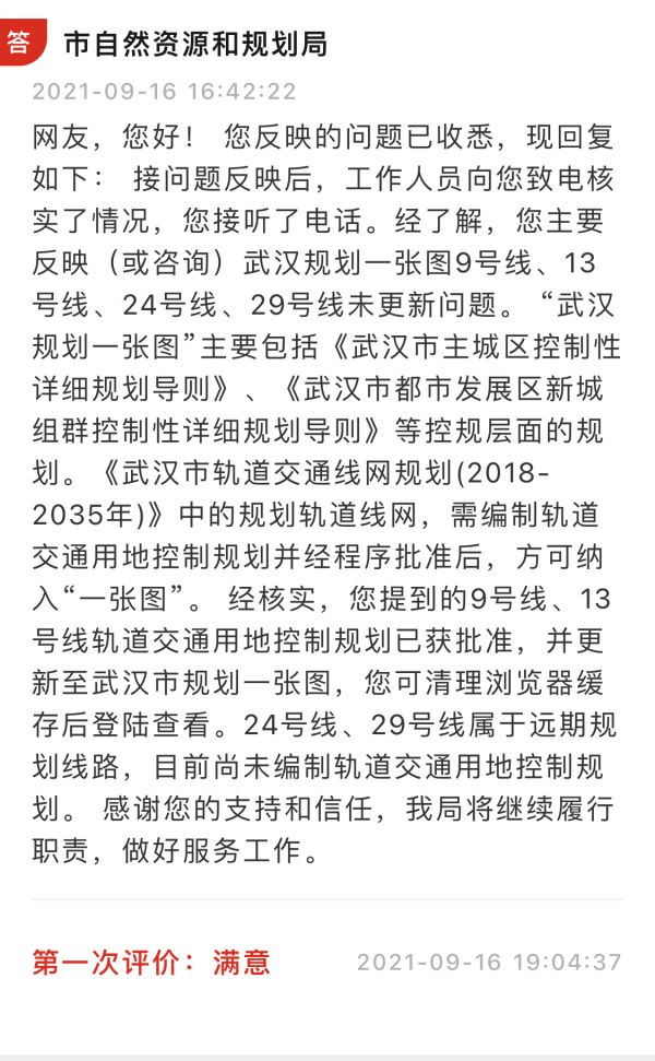 对此,市自然资源和规划局编制规划研究和展示中心回复称,“武汉规划一张图”主要包括《武汉市主城区控制性详细规划导则》《武汉市都市发展区新城组群控制性详细规划导则》等控规层面的规划。《武汉市轨道交通线网规划(2018-2035年)》中的规划轨道线网,需编制轨道交通用地控制规划并经程序批准后,方可纳入“一张图”。经核实,地铁9号线交通用地控制规划已获批准,并更新至“武汉规划一张图”。