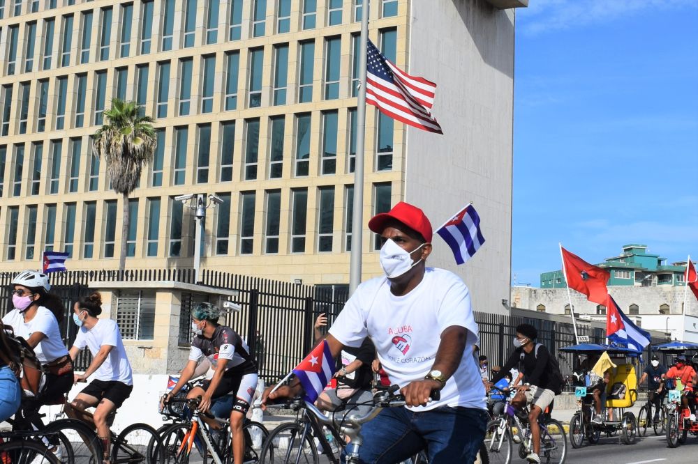 8月5日,在古巴首都哈瓦那,游行队伍经过美国驻古巴大使馆。数百名古巴青年当天在首都哈瓦那举行保卫国家和平、团结反美游行,要求美国解除对古巴近60年的封锁。新华社记者 朱婉君 摄