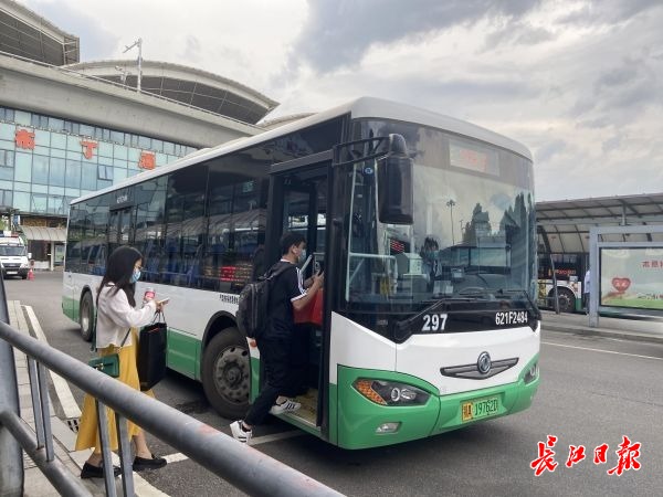 下午4点,在武汉站公交站亭,年轻的詹女士夫妇提着礼盒,正在等候297公交车,他们刚坐高铁从咸宁来武汉,准备去汉口北。詹女士工作在咸宁,家人住在武汉,平均每个月都要来武汉一次,这次放假打算在武汉多呆几天。