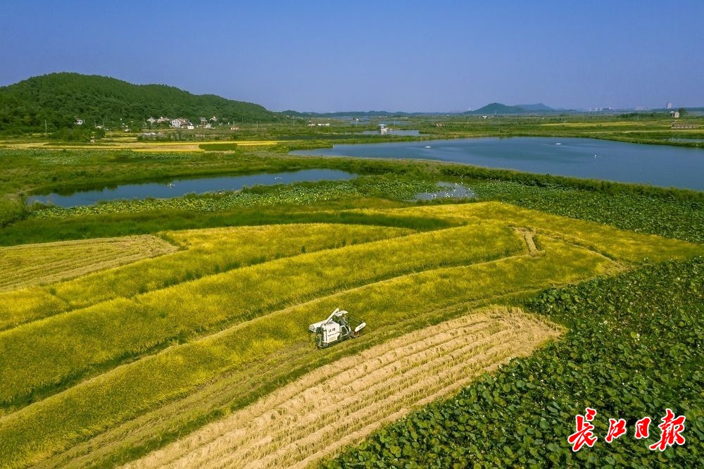 长江日报大武汉客户端9月19日讯 9月18日,“国家级生态乡镇”——蔡甸区桐湖办事处(农场)的1500亩水稻丰收,秋风送爽,稻花飘香,农场职工们开机收割,忙碌的场景与稻田旁的湿地和湖面形成一幅多彩的生态图画,令人流连忘返。(长江日报记者金思柳 通讯员龚建国 摄影报道)