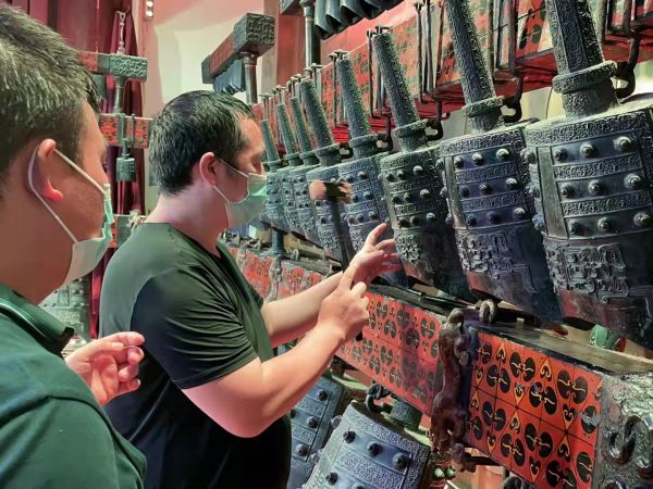 王晓阳在工作人员的带领下,用手触摸编钟。长江日报记者晋晓慧 摄