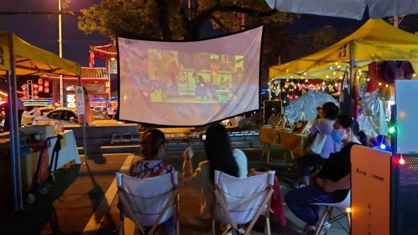 临近武汉植物园的大李市集,也开启了夜间模式,在村口支起了露天电影院。20日晚7点,大李村里响起了《浅田家》的片头曲,不少摊主和游客一同坐在银幕前,享受夜晚的静谧时刻。