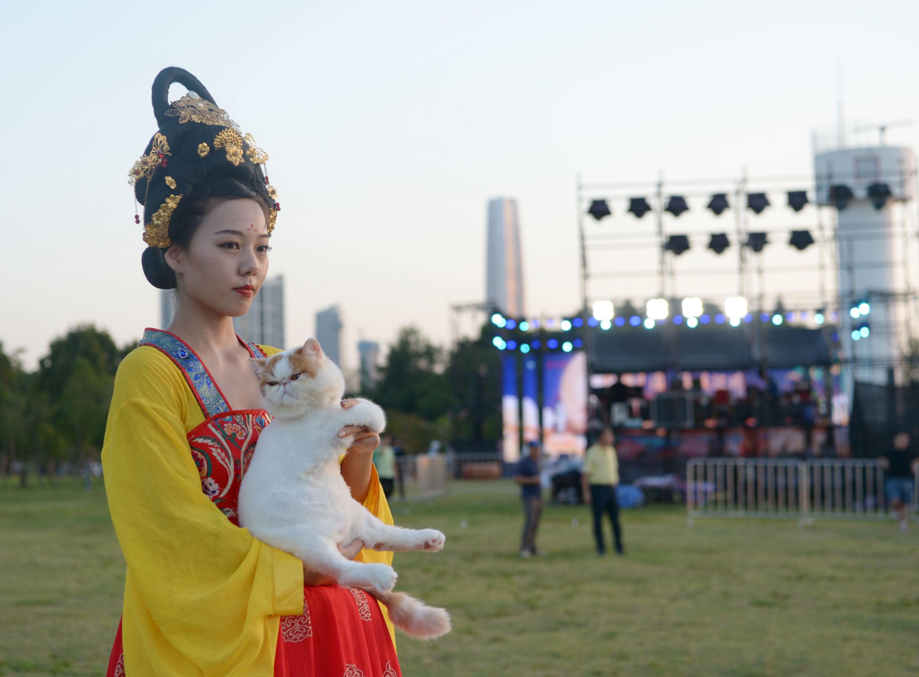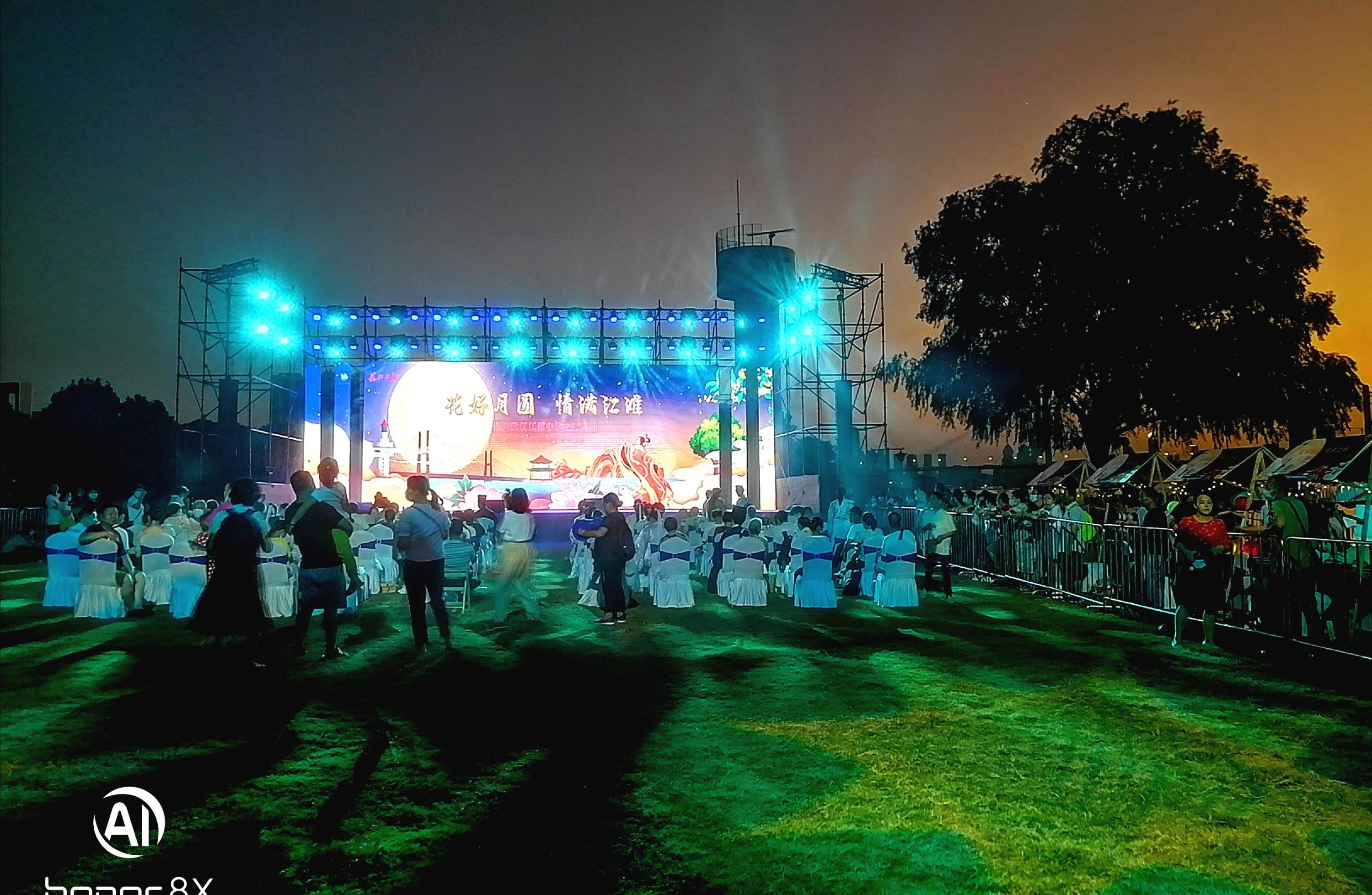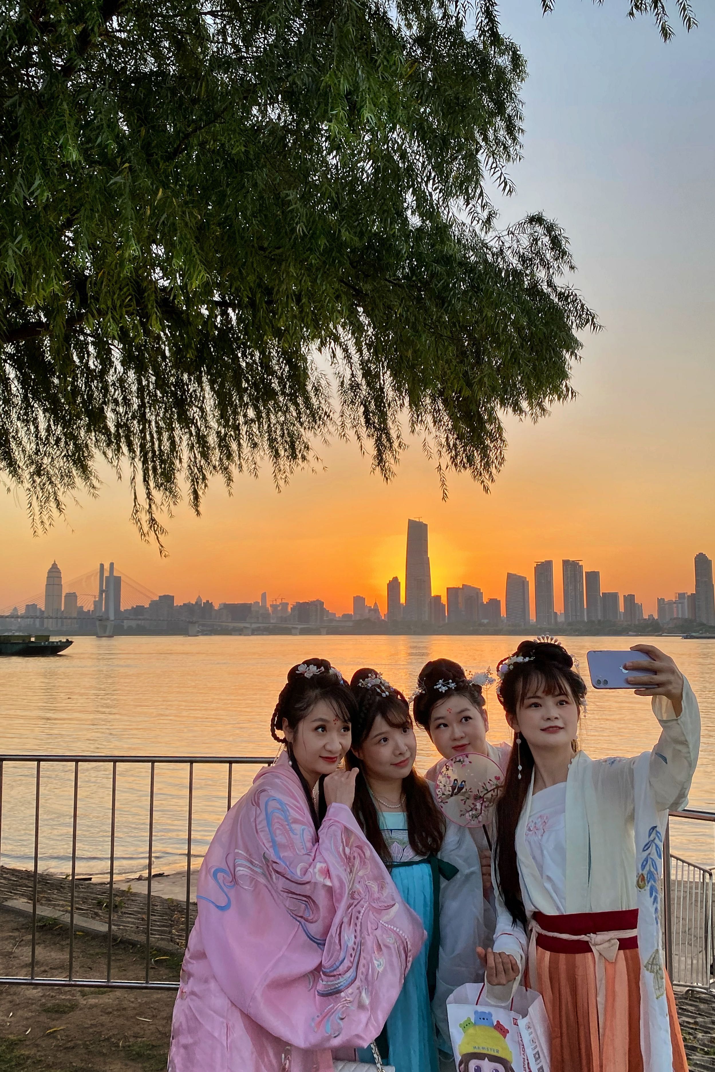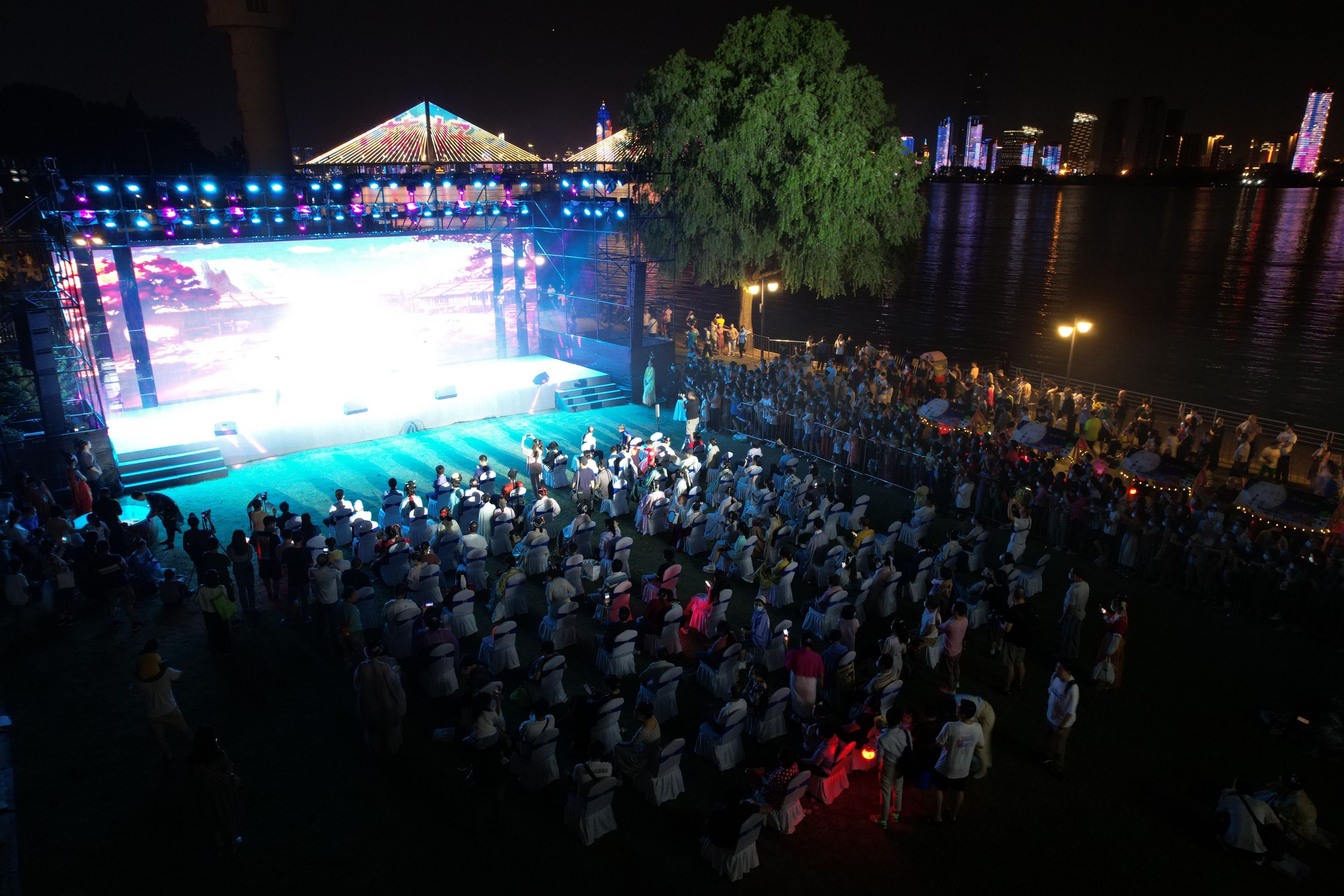 炫丽的舞台搭建在网红树旁,背倚长江夜色,坐拥江滩美景,在摄影师的镜头里,网红树、江水、圆月、舞台同框,“水月中秋”意境唯美。现场的汉服美女古典优雅,吸引了摄影师们的目光和镜头。