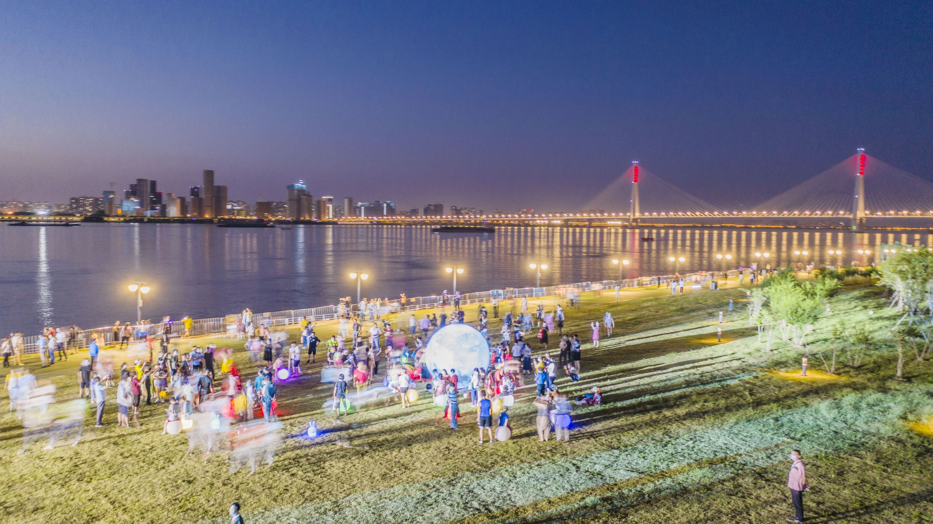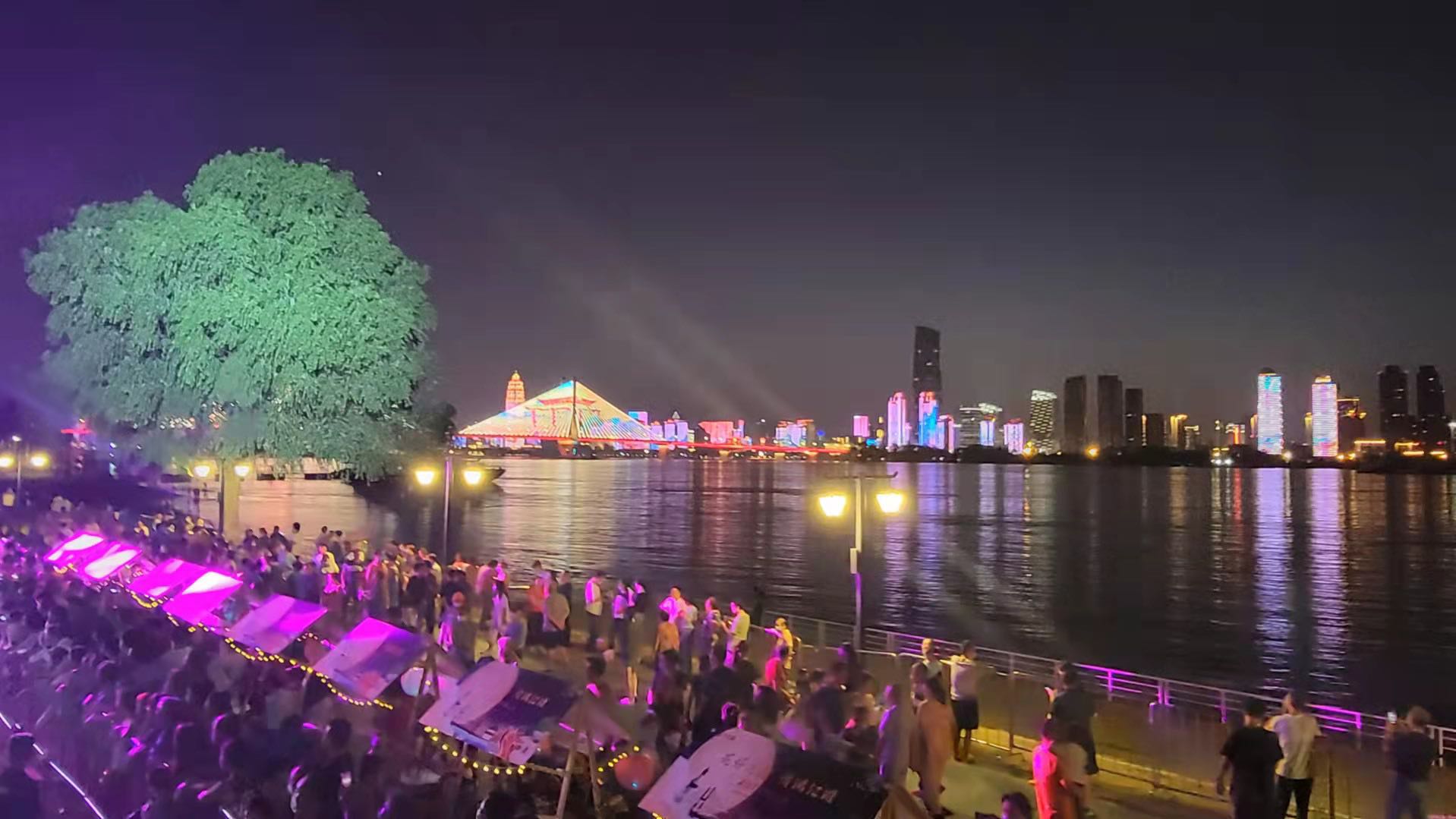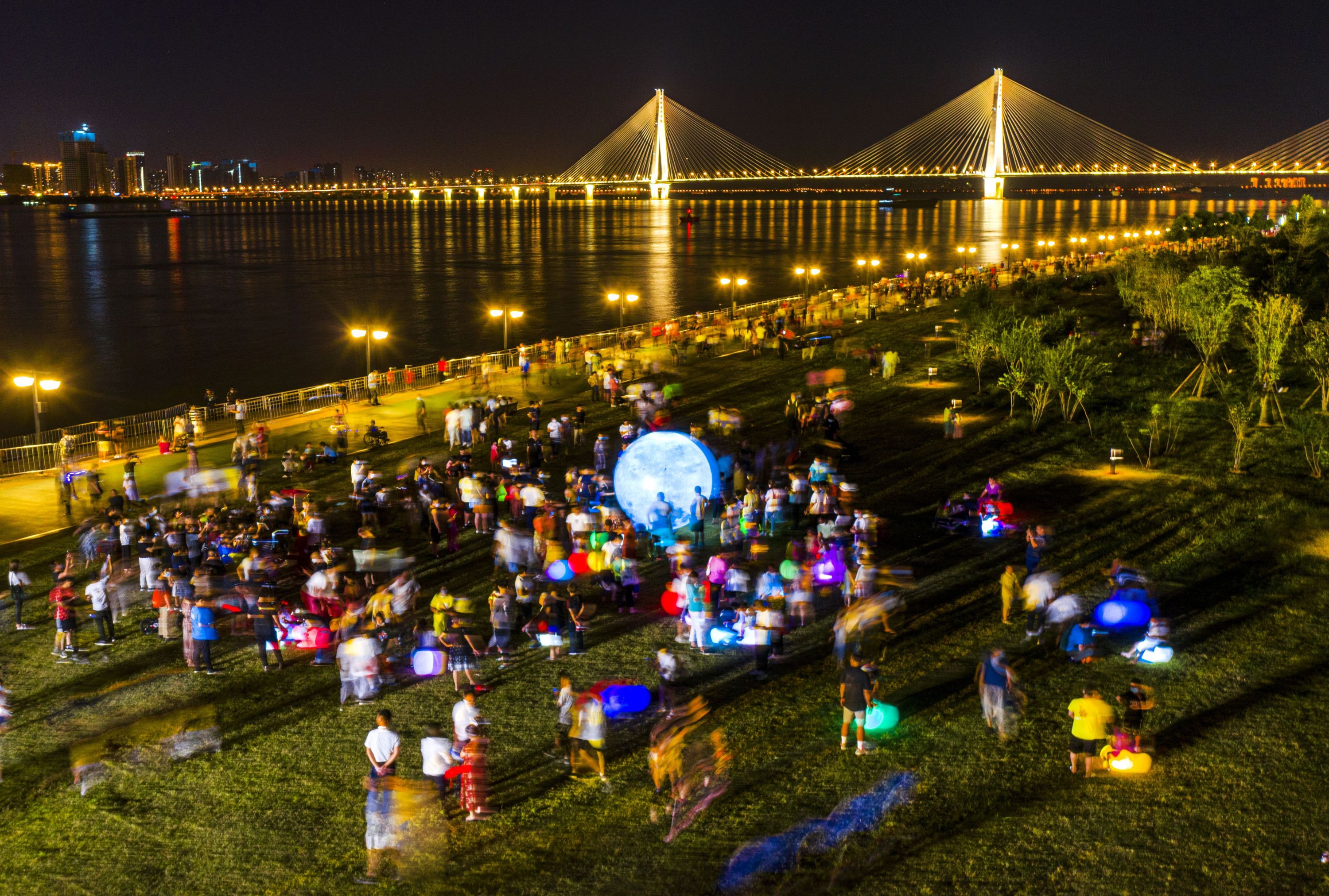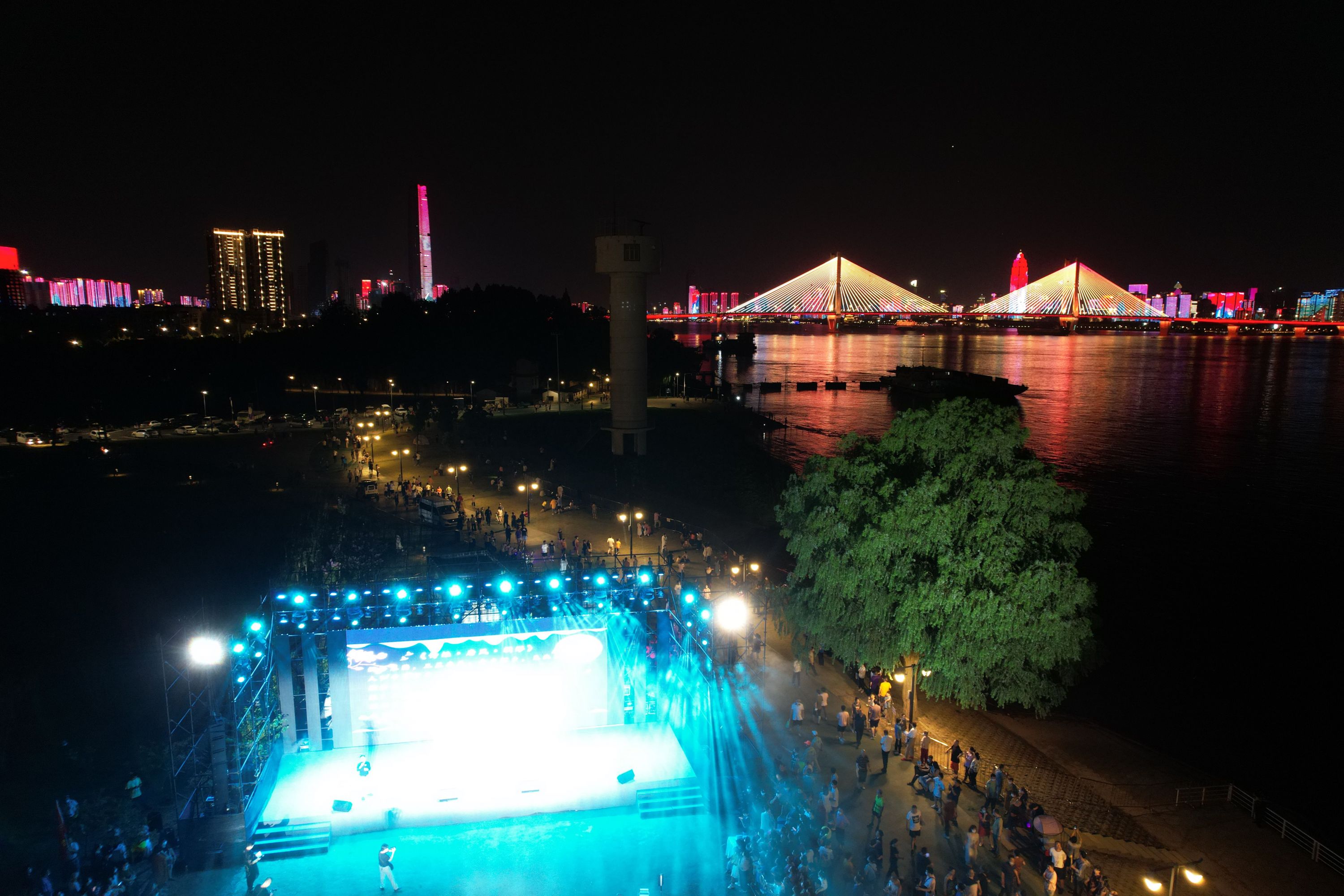 此情此景吸引着摄影师们不停地按动快门,摄影师给记者展示刚刚用无人机拍到的好图:“你看,网红树、舞台、长江二桥同框,江滩步道的灯光像一条橙色的星河,江城太美丽太生动!”