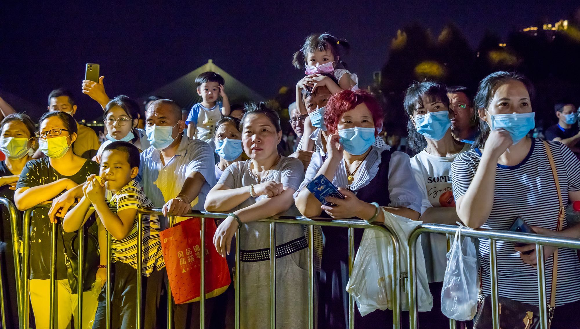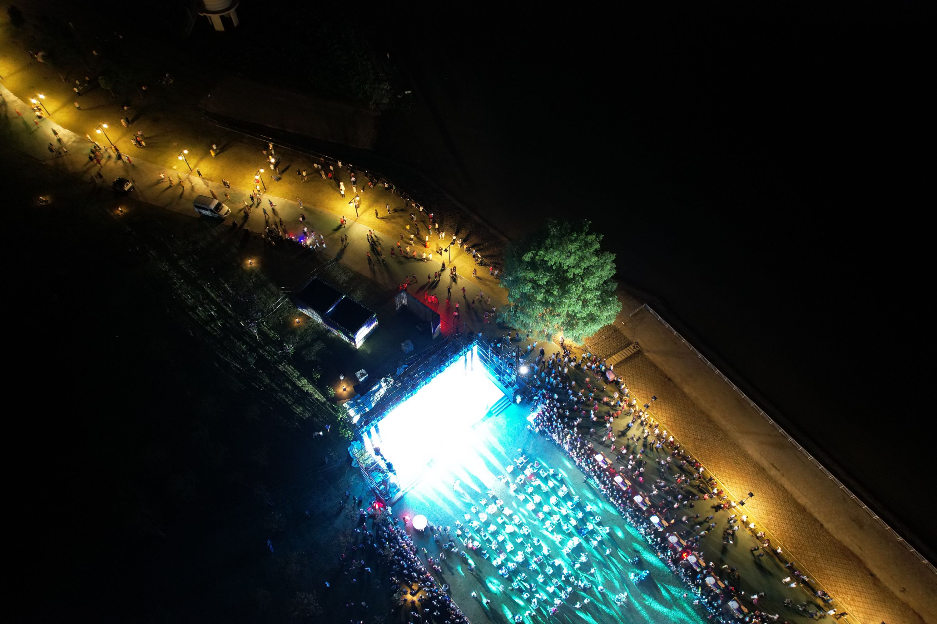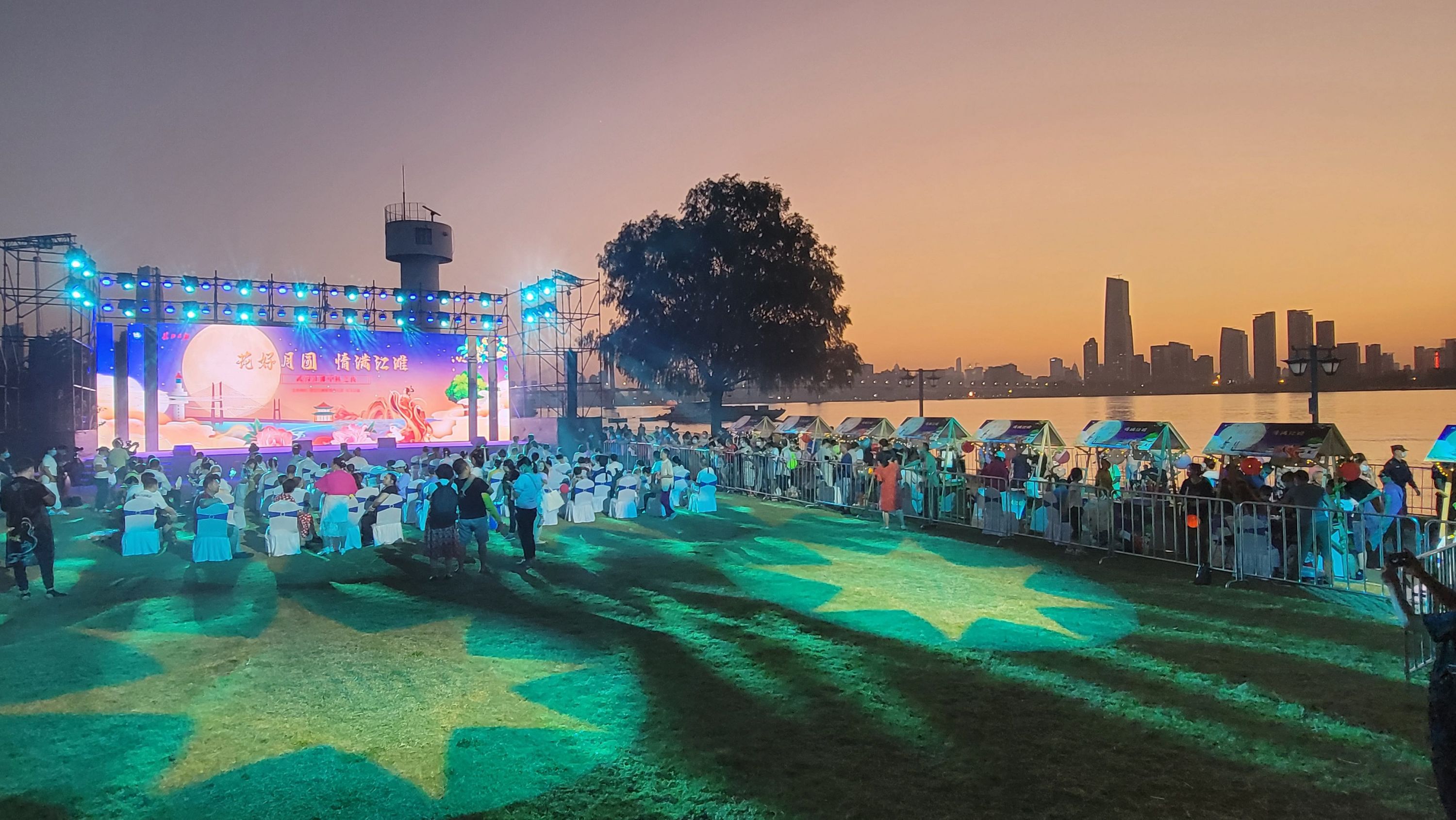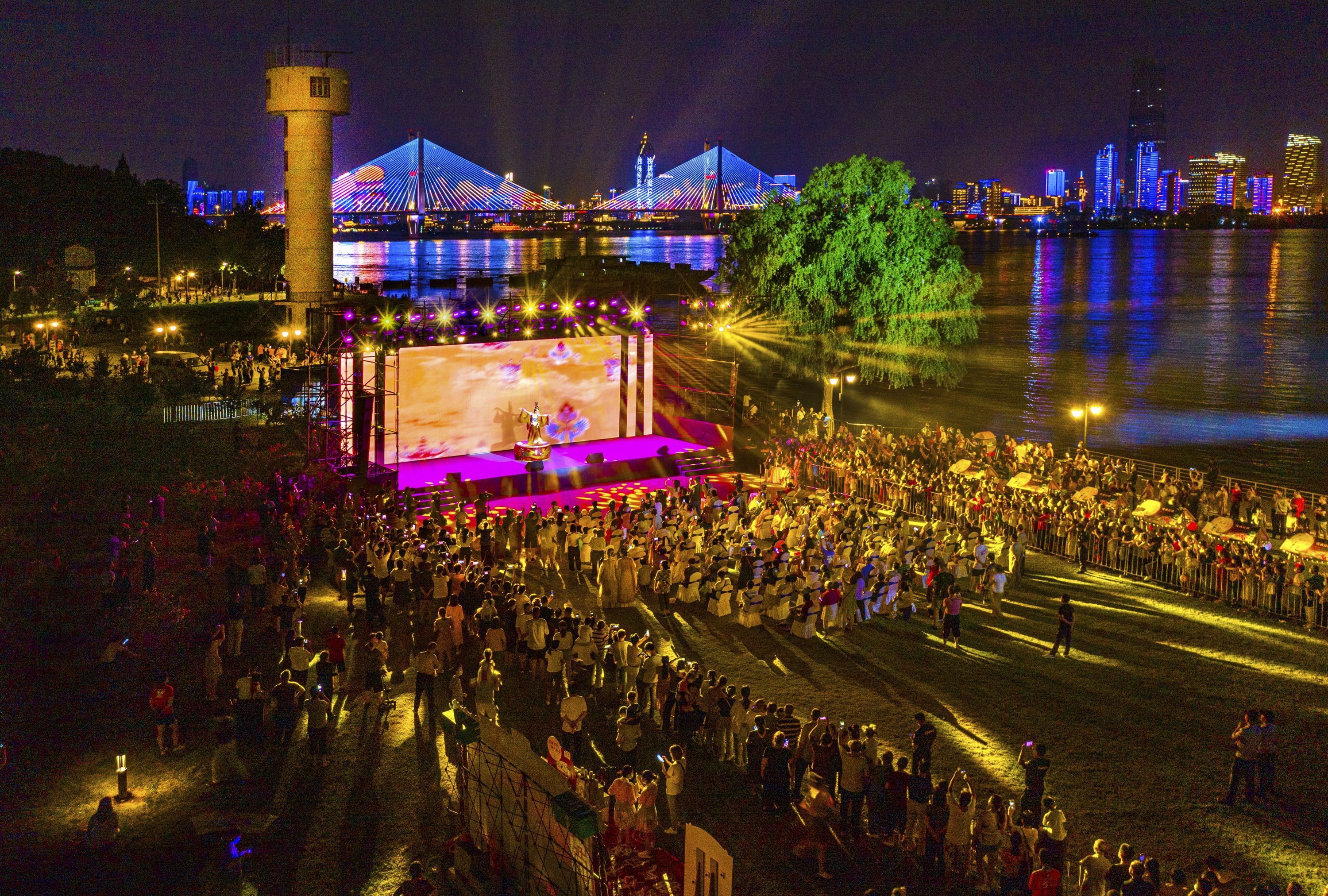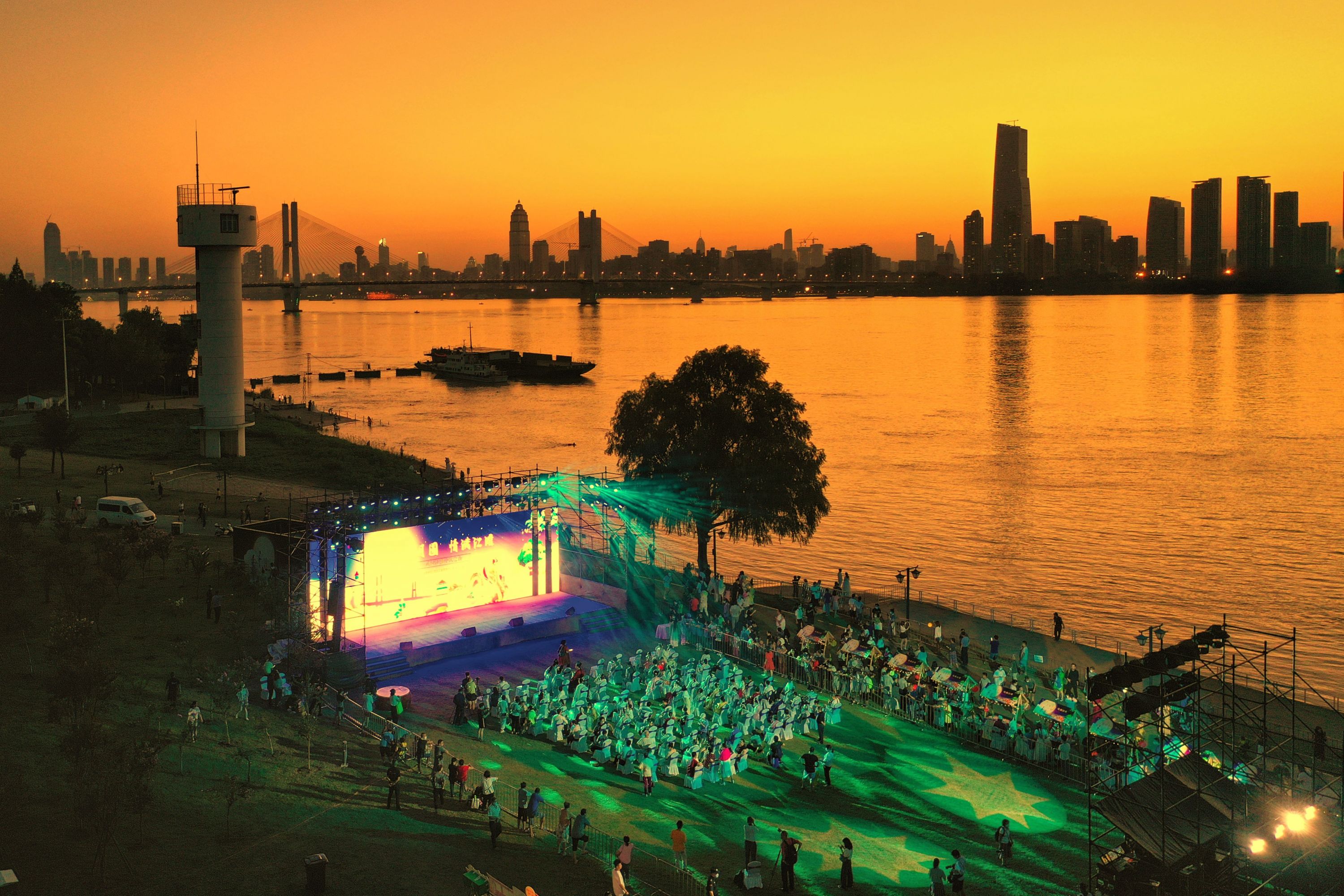 此情此景吸引着摄影师们不停地按动快门,摄影师给记者展示刚刚用无人机拍到的好图:“你看,网红树、舞台、长江二桥同框,江滩步道的灯光像一条橙色的星河,江城太美丽太生动!”