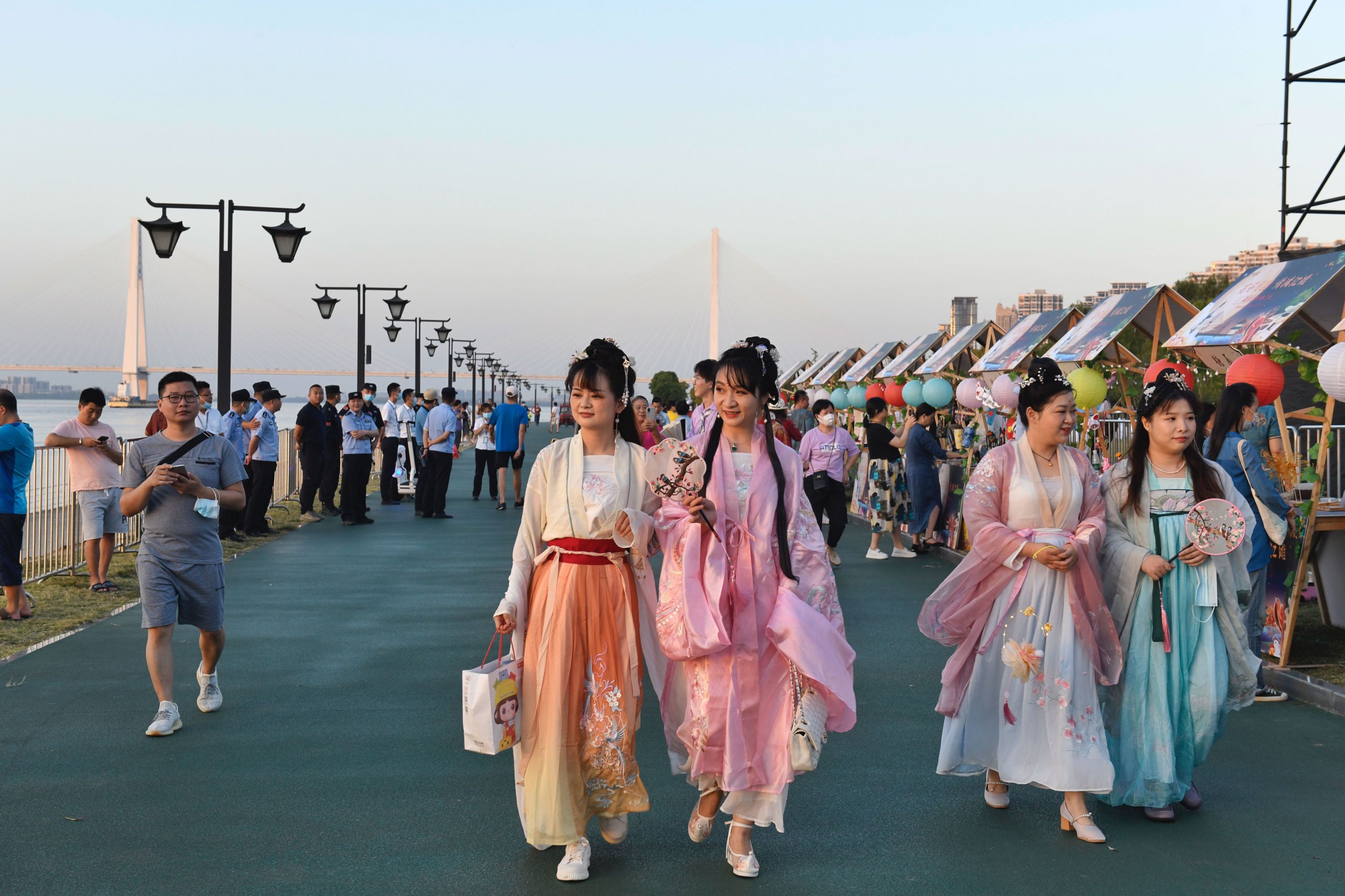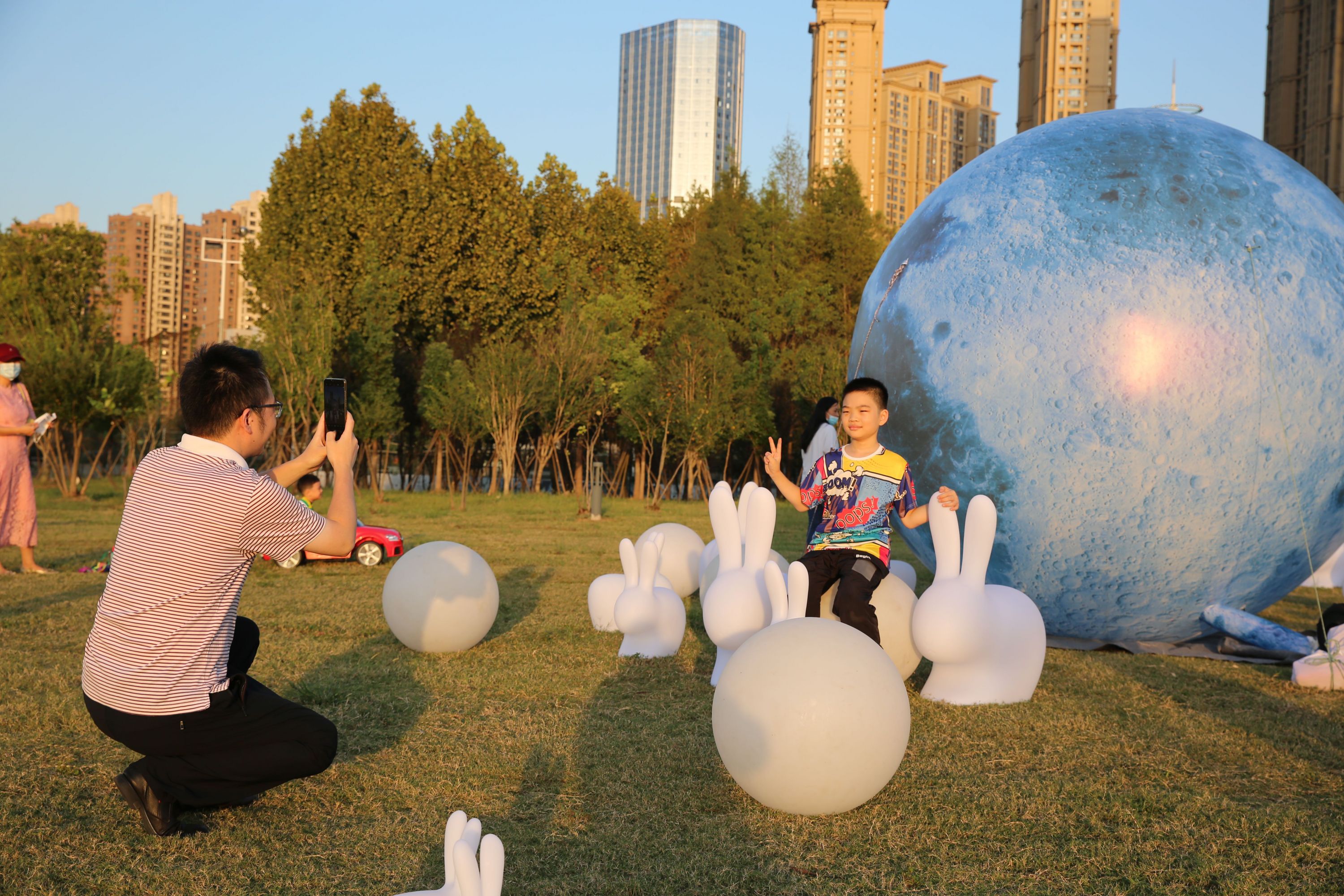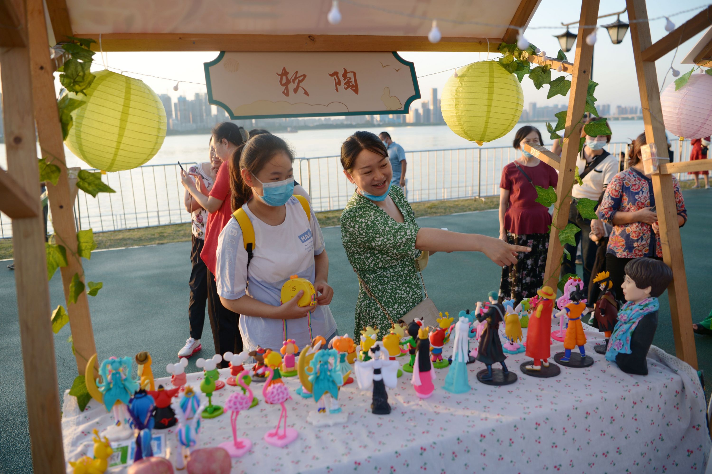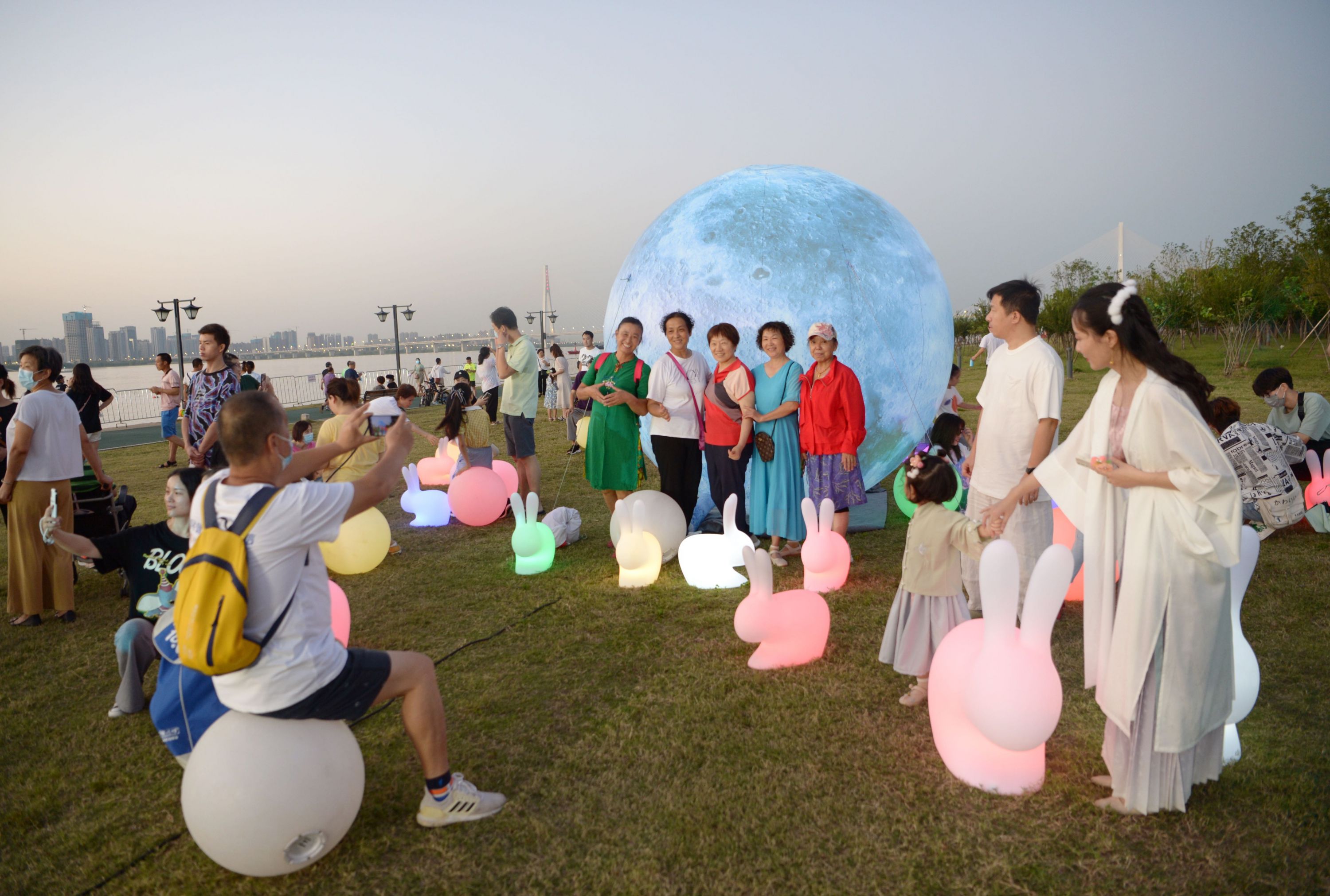 舞台之外,处处透着小惊喜。团圆市集十分热闹,市民和游客在草坪闪光月球、玉兔造型灯前摆好拍照姿势。非遗互动区展示着油纸伞、扎灯笼等手工艺品,汉派非遗传承人还现场展示手艺。现场市民和亲朋好友相伴,在摊位前流连,挑选喜欢的小物件,灯光映着笑脸,凉凉秋夜中感受着温暖与惬意。