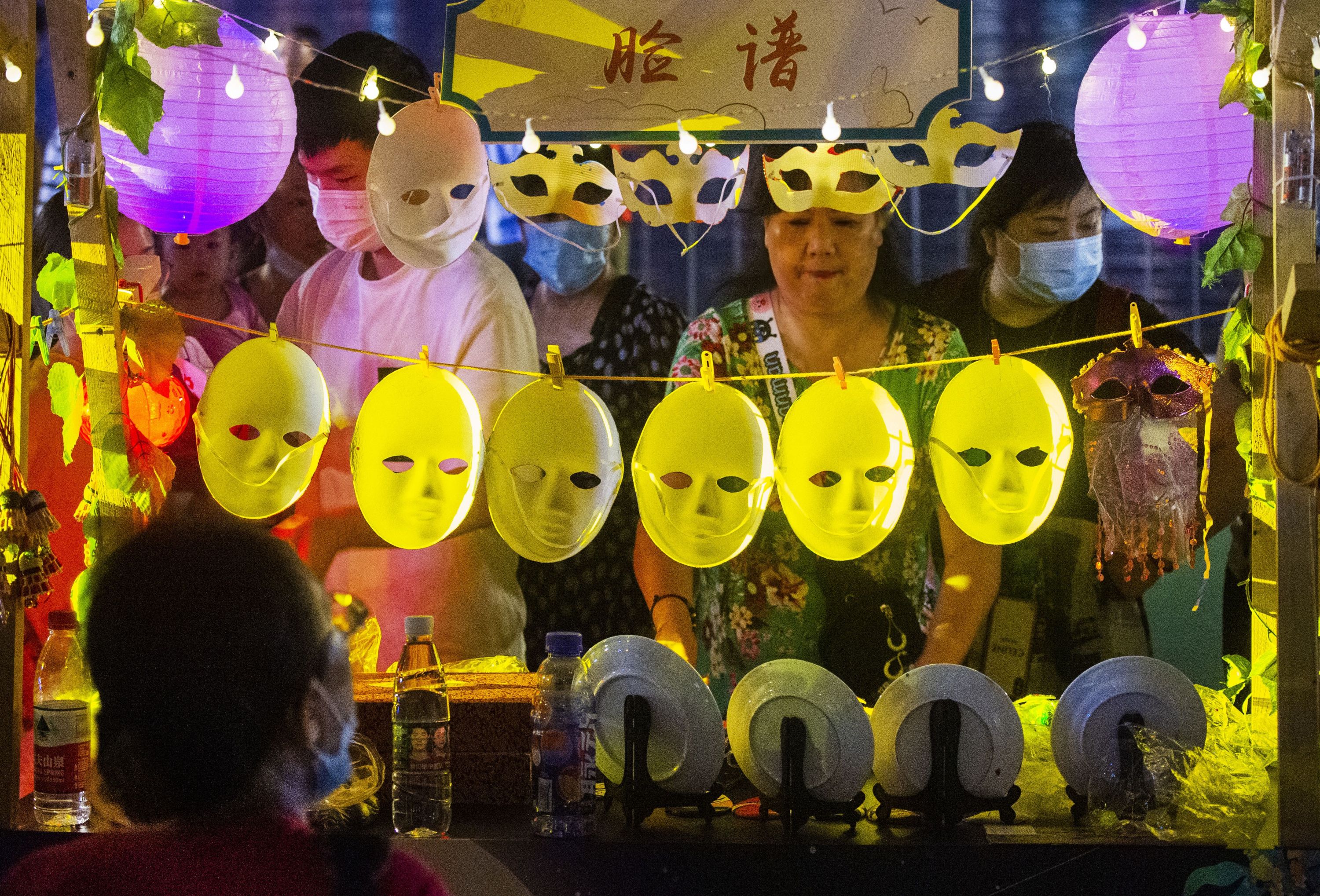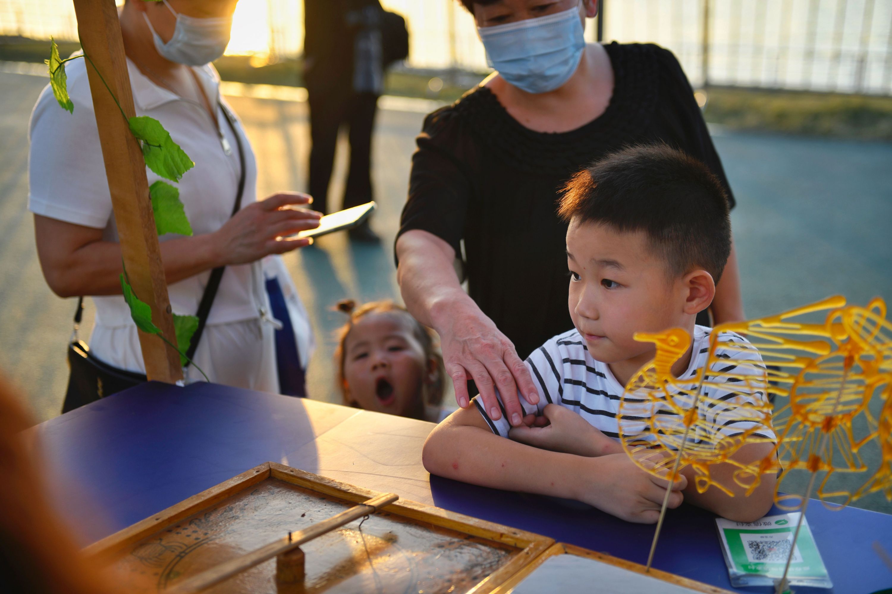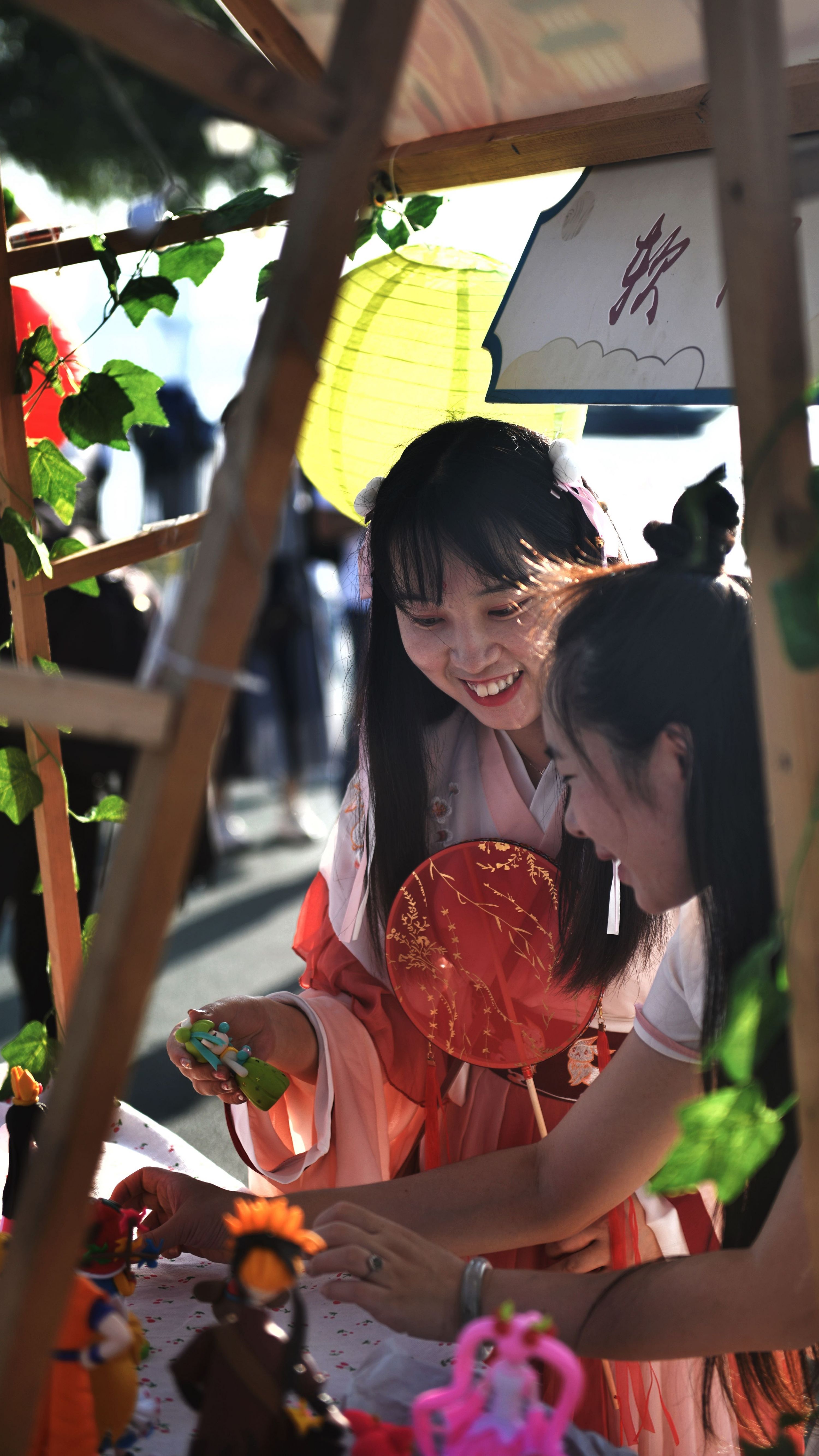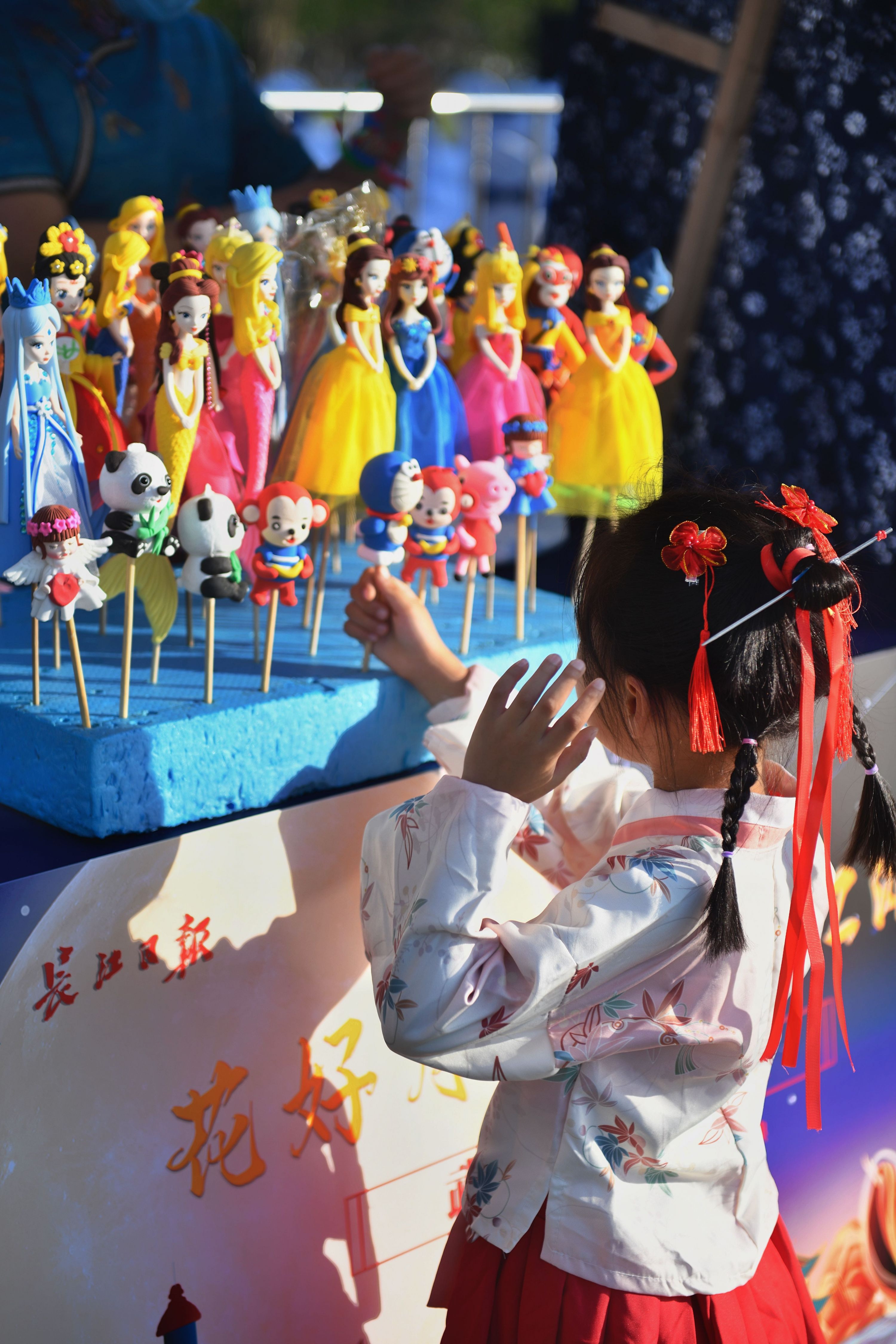 舞台之外,处处透着小惊喜。团圆市集十分热闹,市民和游客在草坪闪光月球、玉兔造型灯前摆好拍照姿势。非遗互动区展示着油纸伞、扎灯笼等手工艺品,汉派非遗传承人还现场展示手艺。现场市民和亲朋好友相伴,在摊位前流连,挑选喜欢的小物件,灯光映着笑脸,凉凉秋夜中感受着温暖与惬意。