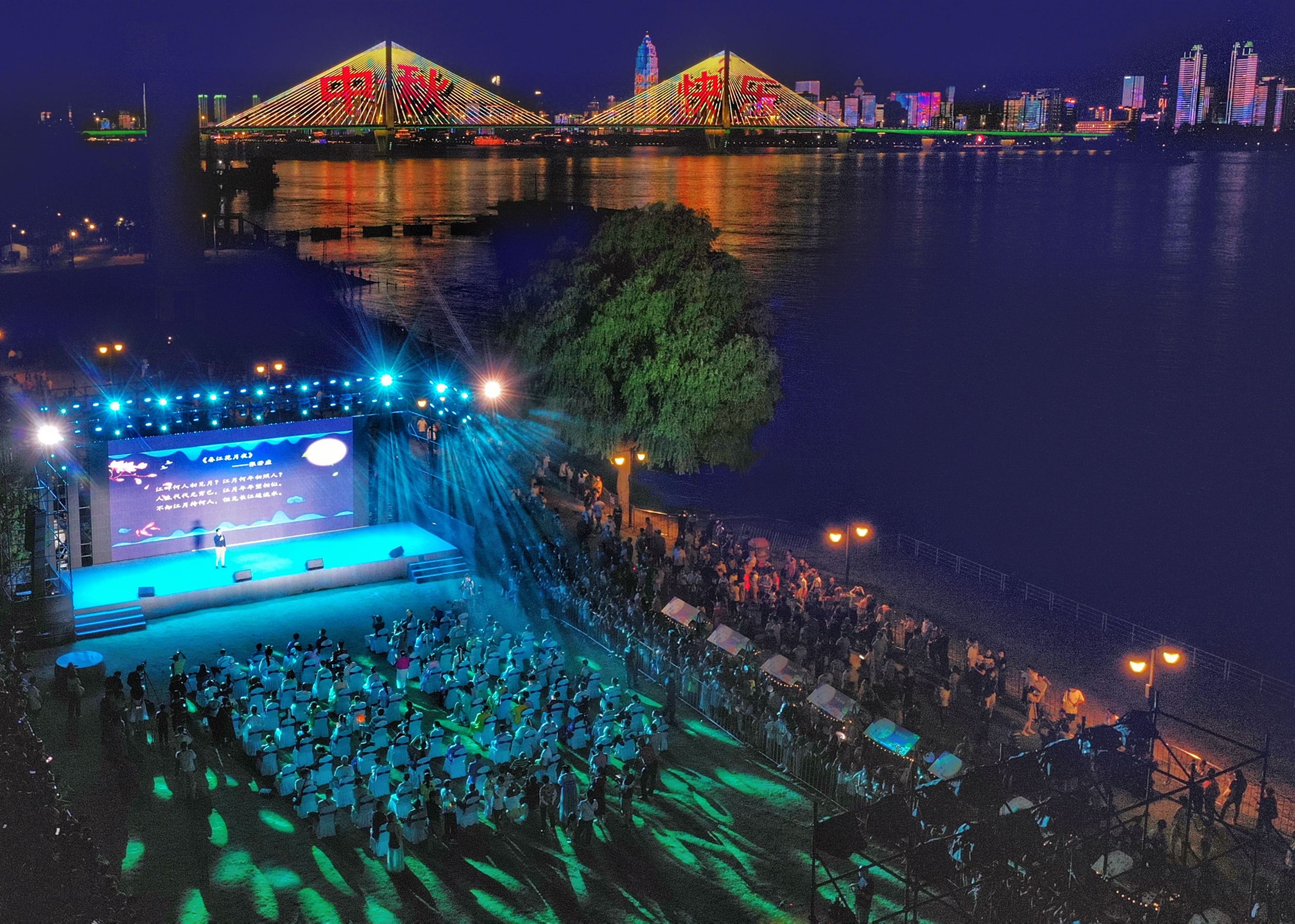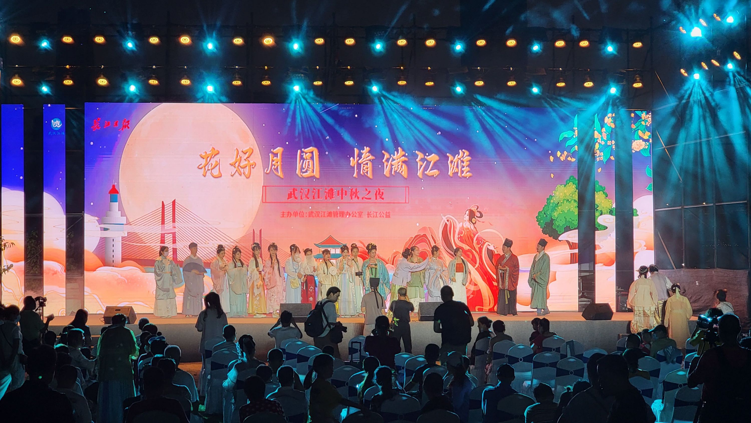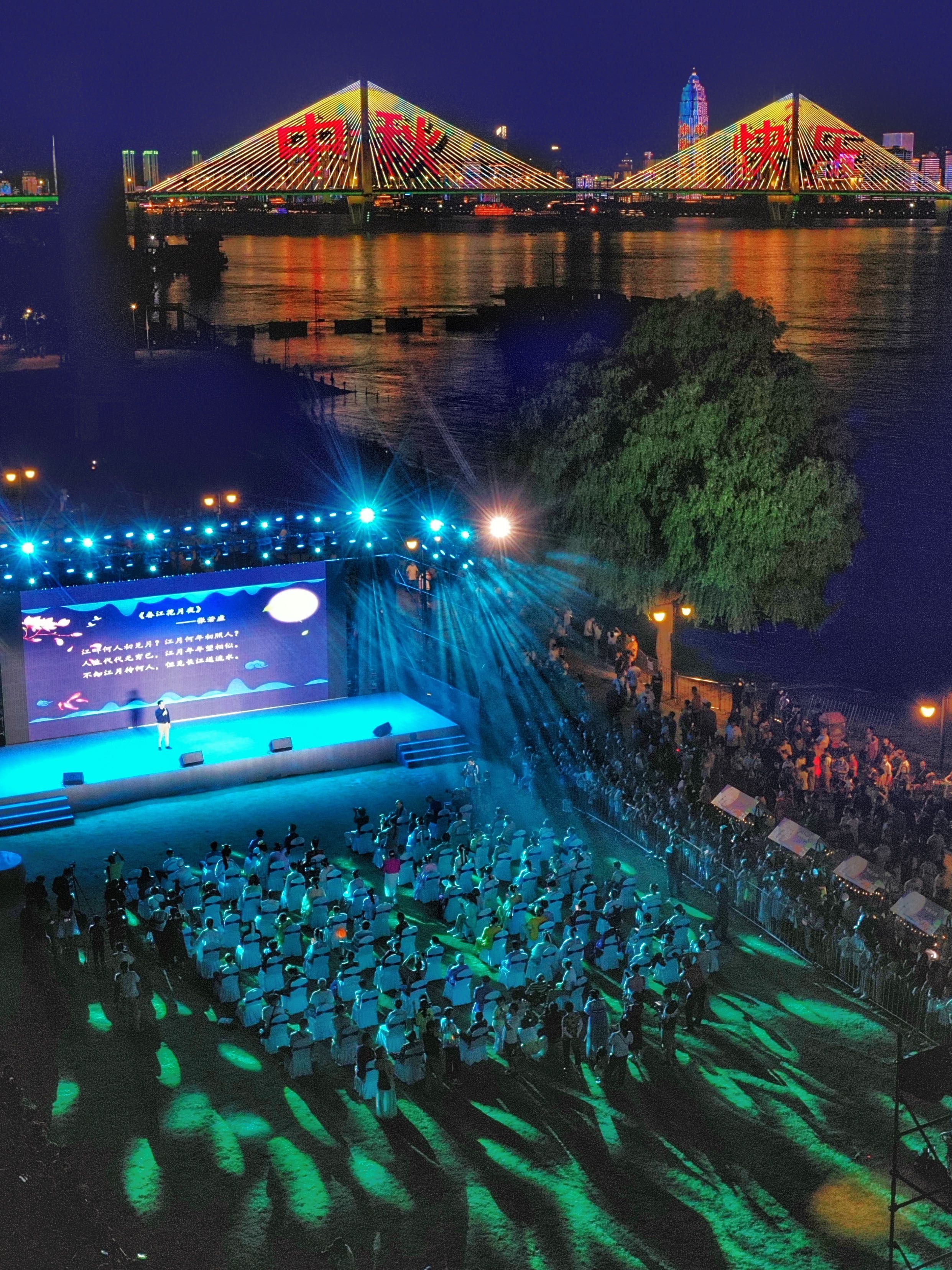 舞台上,演员们吟诵着中秋诗词,表演着优美的歌舞,观众们抬头赏明月,低头看好戏,精彩之处笑意盈盈。这些美好的场景,都被定格在摄影师的镜头中。