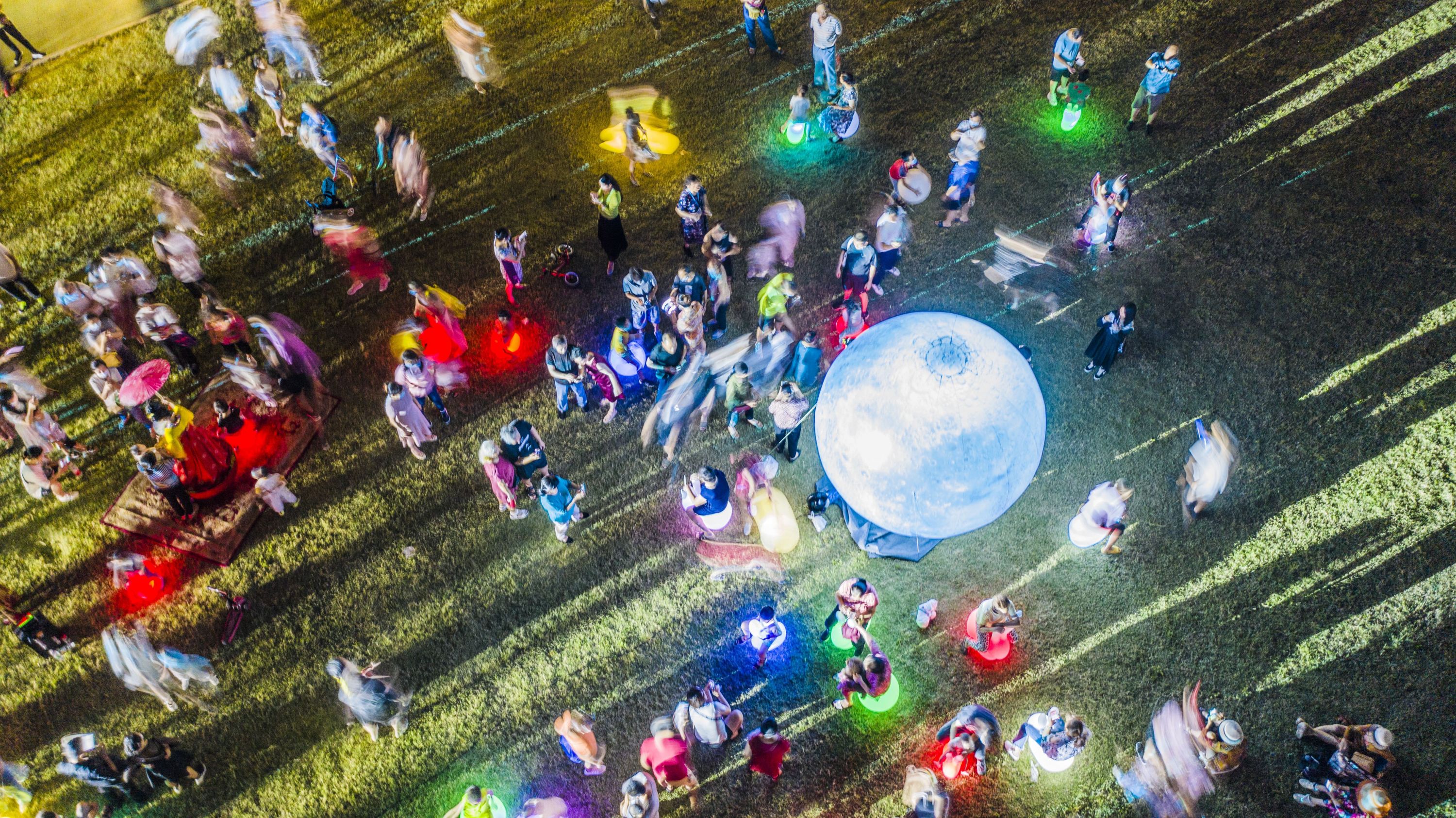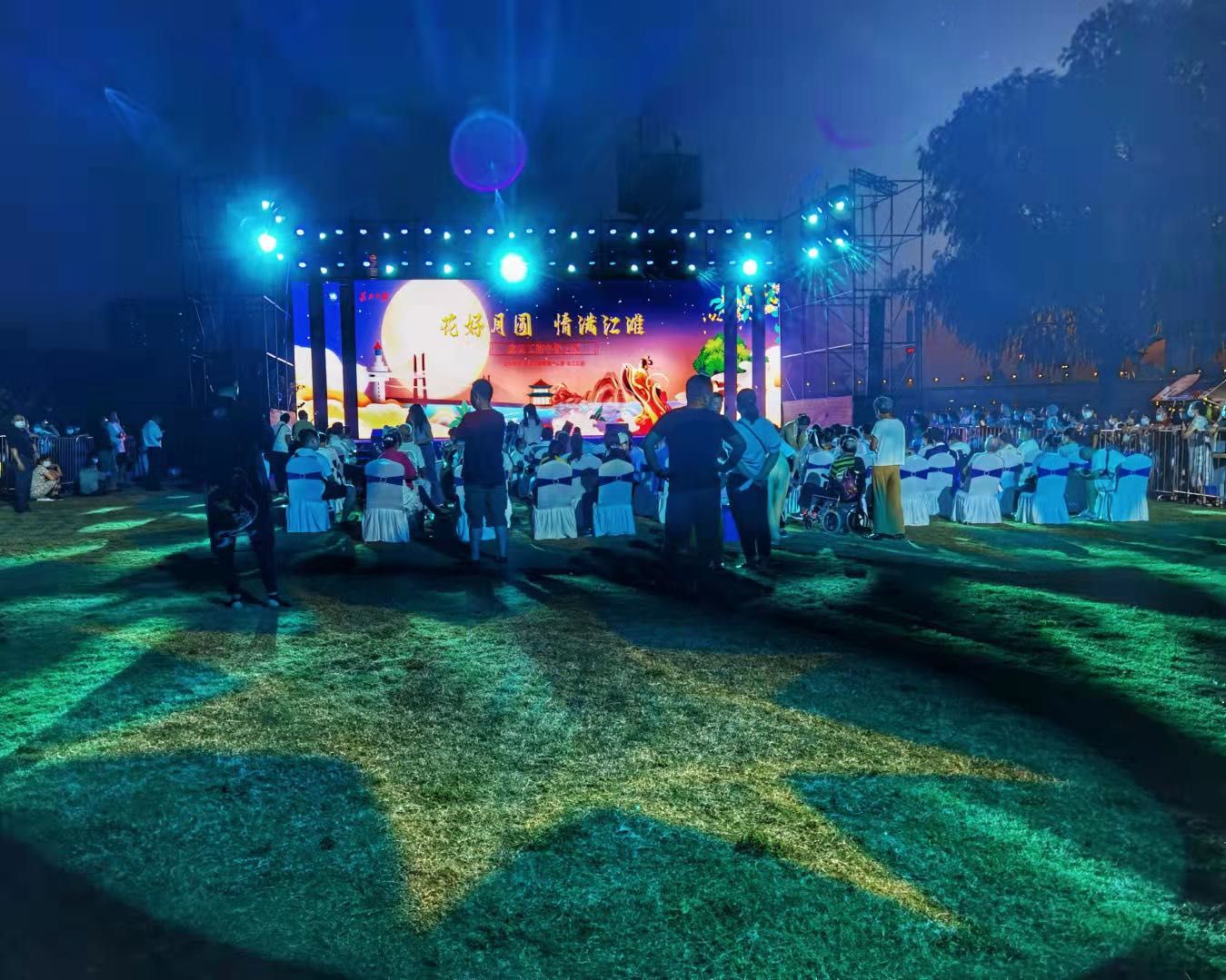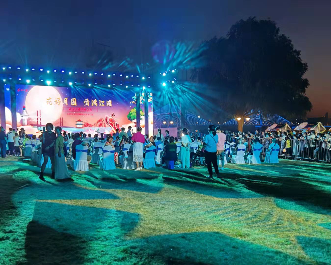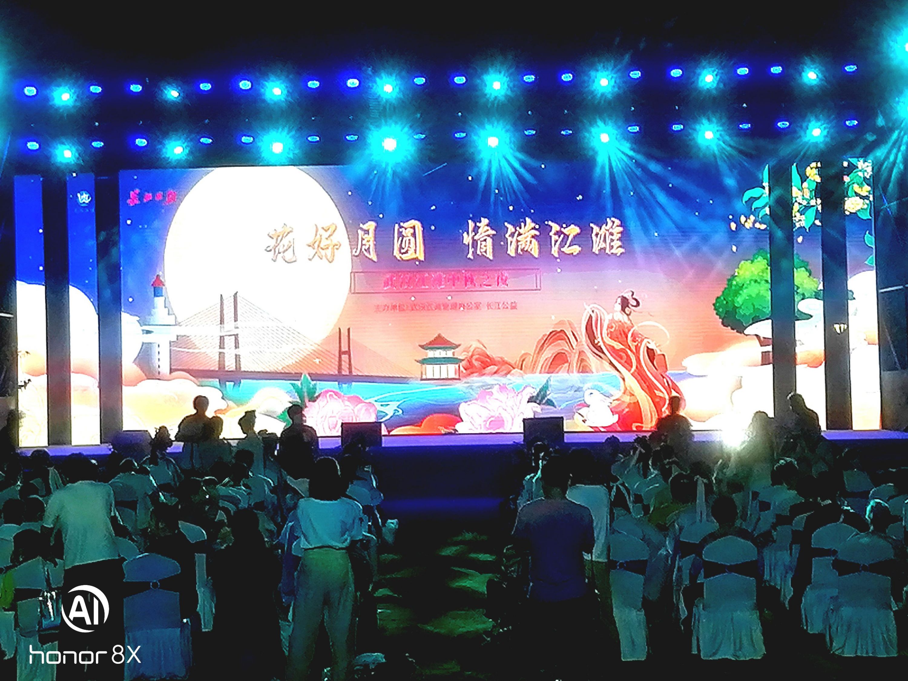 舞台上,演员们吟诵着中秋诗词,表演着优美的歌舞,观众们抬头赏明月,低头看好戏,精彩之处笑意盈盈。这些美好的场景,都被定格在摄影师的镜头中。