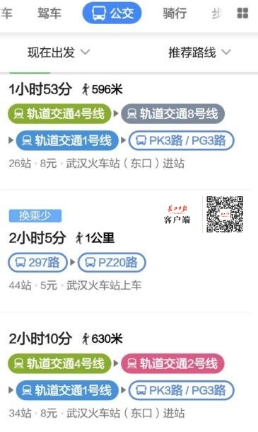 长江日报记者通过武汉智能公交APP和地图软件等查询发现,乘坐公共交通工具往返武汉火车站至黄陂城区,大体有4条线路,预估乘车时间从2小时至2小时50分不等。分别是,乘坐地铁4号线换乘8号线再换乘1号线至汉口北,再转乘班车;乘坐地铁4号线换乘8号线至宏图大道,再转乘295路公交;乘坐297路公交至黄陂武湖,再转乘班车;乘坐地铁4号线换乘地铁2号线到汉口火车站,再转乘292路公交。