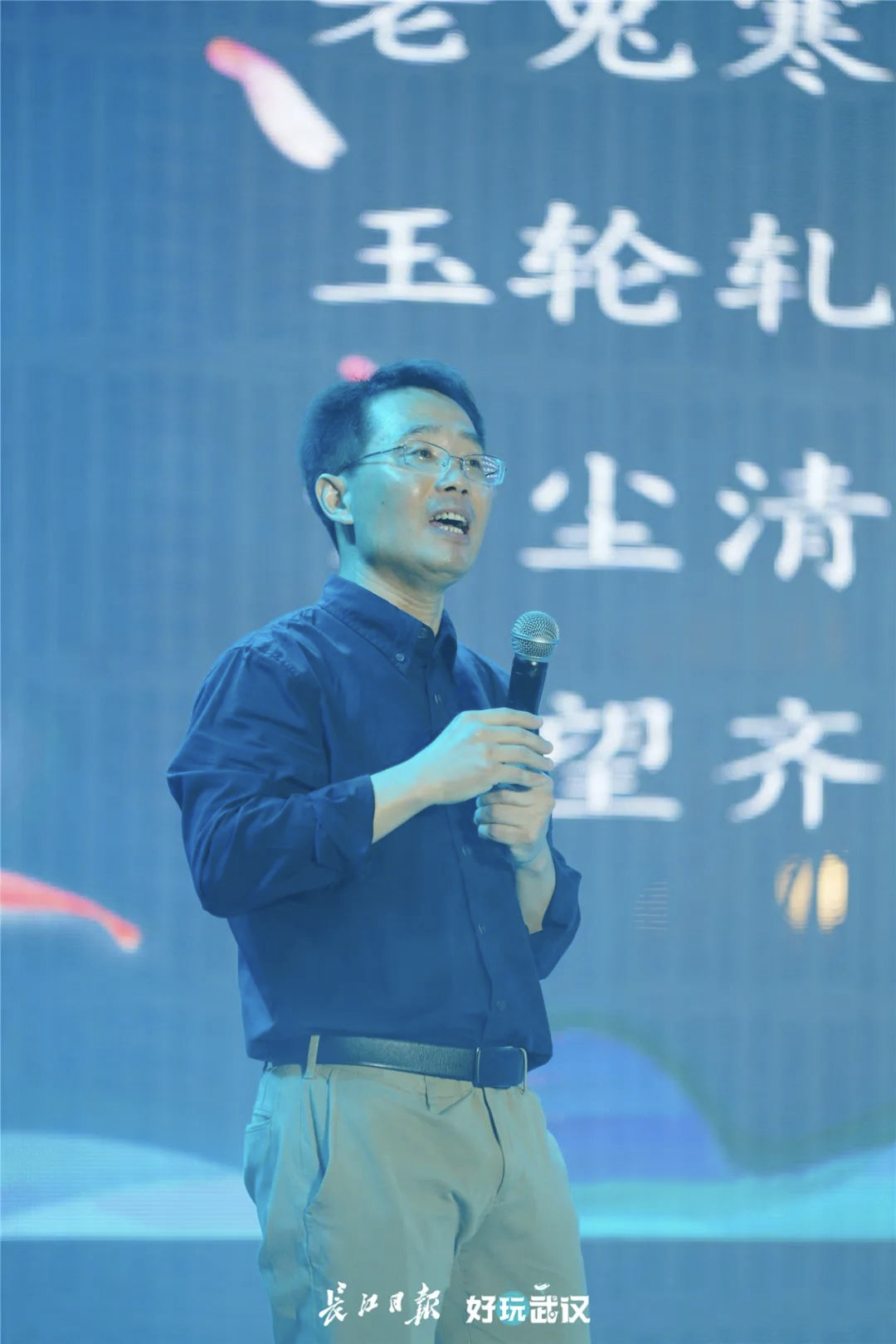 林岩一袭休闲打扮,精神登台,面对打围的市民亲切开讲:“江滩皓月当空,江水东逝,无疑构成了一幅‘素月分辉、明河共影’的绝妙画图。”面对此情此景,林教授首先吟诵张若虚名篇《春江花月夜》中的诗句。
