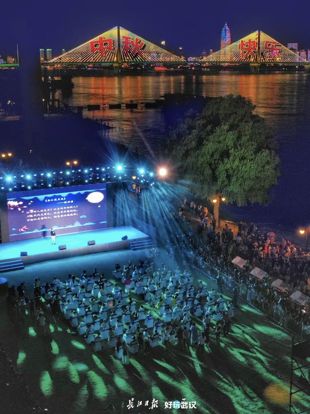 林岩带领现场市民诵读《诗经·唐风·绸缪》。他说:“今年中秋之夜的主题是‘花好月圆 情满江滩’,江滩作为武汉最具城市特质的地方,这里也是青年朋友们寻找爱情、收获爱情的浪漫之地。今晚我们相约网红打卡地‘孤独的树’,这篇歌咏爱情的诗歌富有现代感,读起来朗朗上口,很契合现场朋友表达情思情感。”林教授表示,在中秋之夜、在江滩吟诵诗词,此景此情别致浪漫,愿大家收获幸福。