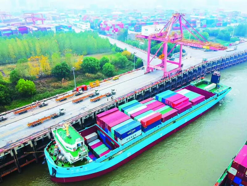 武汉市首艘江海直达1140型集装箱示范船靠岸装货