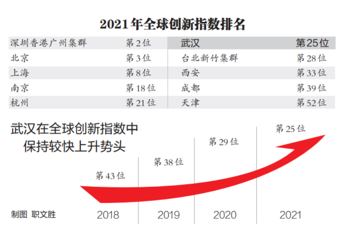 长江日报记者查阅发现,在2018—2021年的全球创新指数中,武汉由第43位、第38位、第29位到今年的第25位,保持较快上升势头,成为中国经济快速发展同时“含新量”不断递增的缩影。