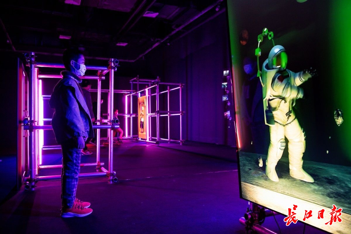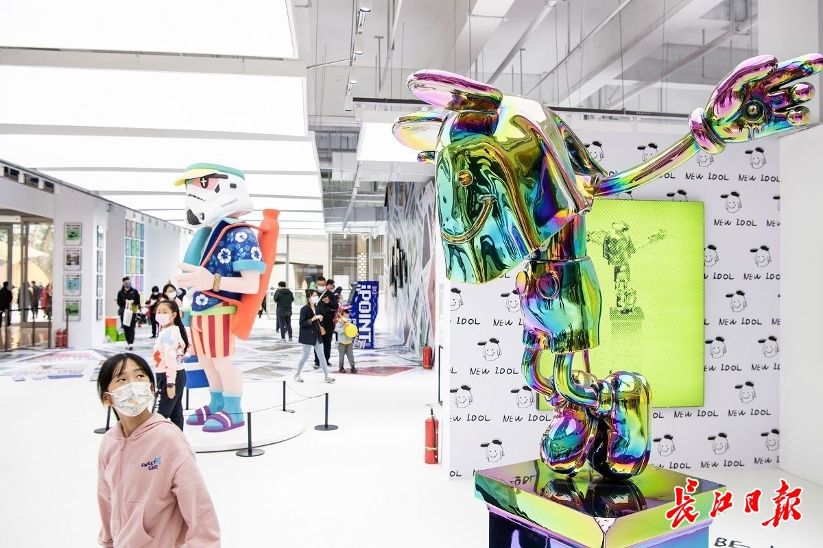 记者逛一圈发现,与武汉其他商业体不同,万象城各品牌店铺之间,充满了艺术美感和武汉元素,融前沿风尚、格调社交、艺文美学为一体。从2号门一进去,便是《明日浪潮》艺术作品展。该展览是万象城与上海昊美术馆旗下艺术品牌How+合作,由ZUOYOU担任策展团队,创造性地策划了“雕塑+新媒体艺术+潮流艺术+艺术超市”的全场景艺术体验,在商业空间为市民提供美术馆观展体验。上午11时左右,入口处开始限流排队。家住附近的李先生,趁排队间隙给上小学四年级的儿子讲述展览背景,小朋友听得津津有味。他告诉记者,儿子喜欢看新潮科幻的展览,“一边逛商场,一边给孩子普及艺术美学,一举两得,以后我们会常常来。”