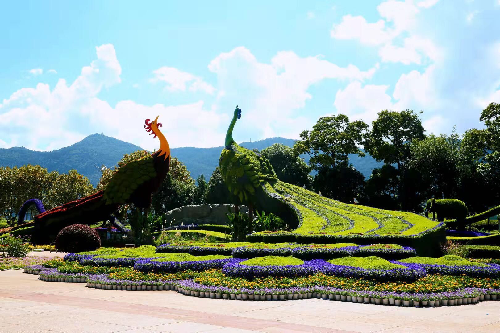 该作品主题为“楚凤来仪,春城遇知音”,寓意“凤凰与孔雀共鸣,武汉同昆明齐飞”。只见代表武汉的“楚凤”和代表昆明的“绿孔雀”昂首伫立,品种丰富、颜色各异的花卉,将两只神鸟的羽毛等细节也刻画得栩栩如生。整个立体花坛与国旗台、广场及海埂会堂呈中轴对称布局,两只神鸟的羽毛呈90度角朝向东侧合围国旗台,从海埂会堂方向看,只见如瀑布般的鲜花与绿植倾泻而下,非常壮观。