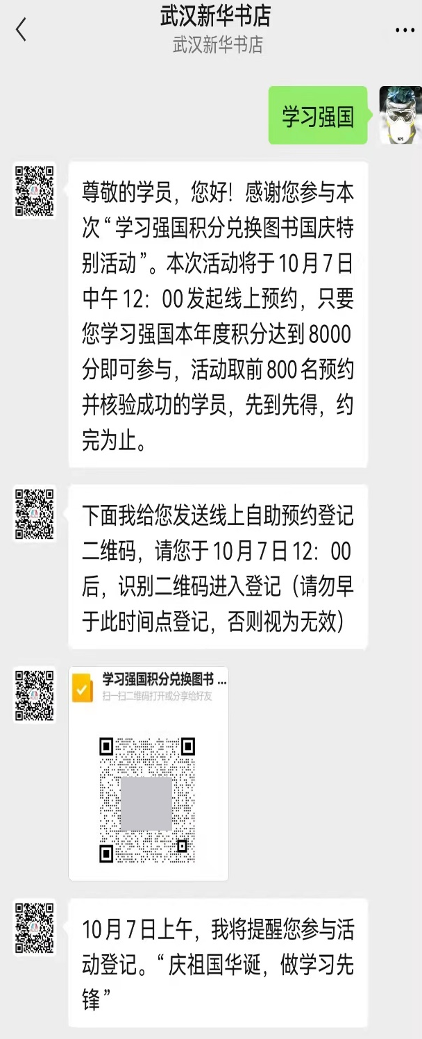 1.添加“武汉新华书店”官方企业微信,发送“学习强国”关键字,获取线上预约登记入口。