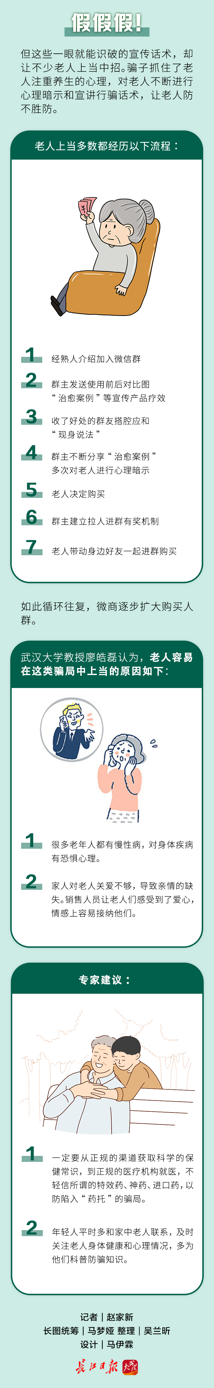 廖教授建议老人,一定要从正规的渠道获取科学的保健常识,到正规的医疗机构就医,不轻信所谓的特效药、神药、进口药,以防陷入“药托”的骗局。建议年轻人平时多多和家中老人联系,了解近况,及时关注老人身体健康和心理情况,日常多多为他们科普防骗知识。