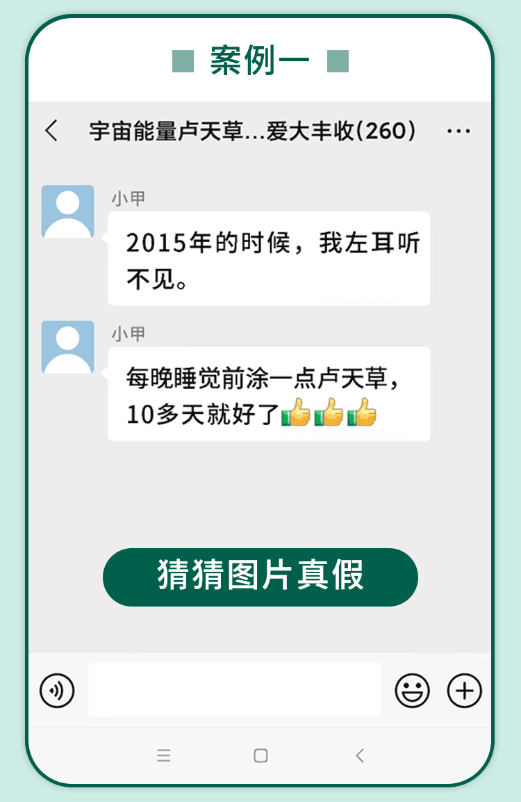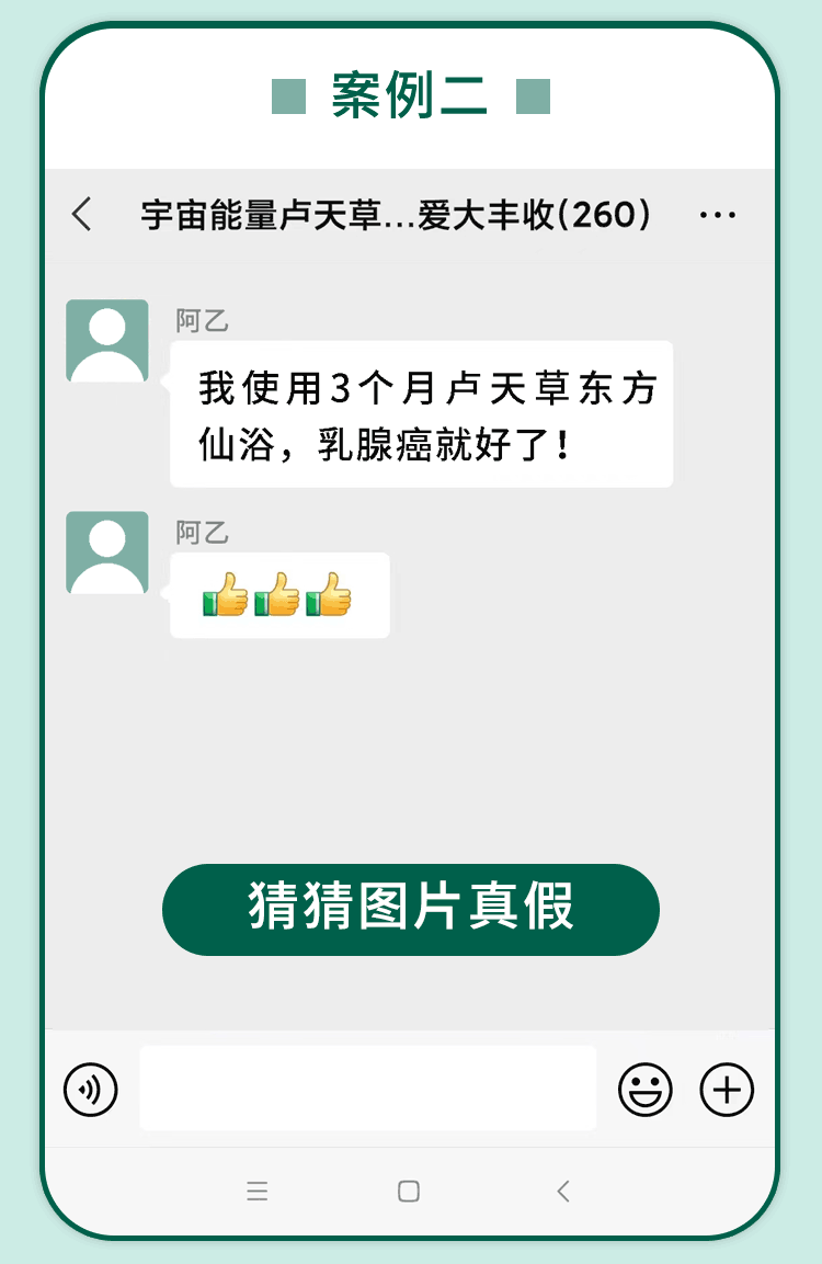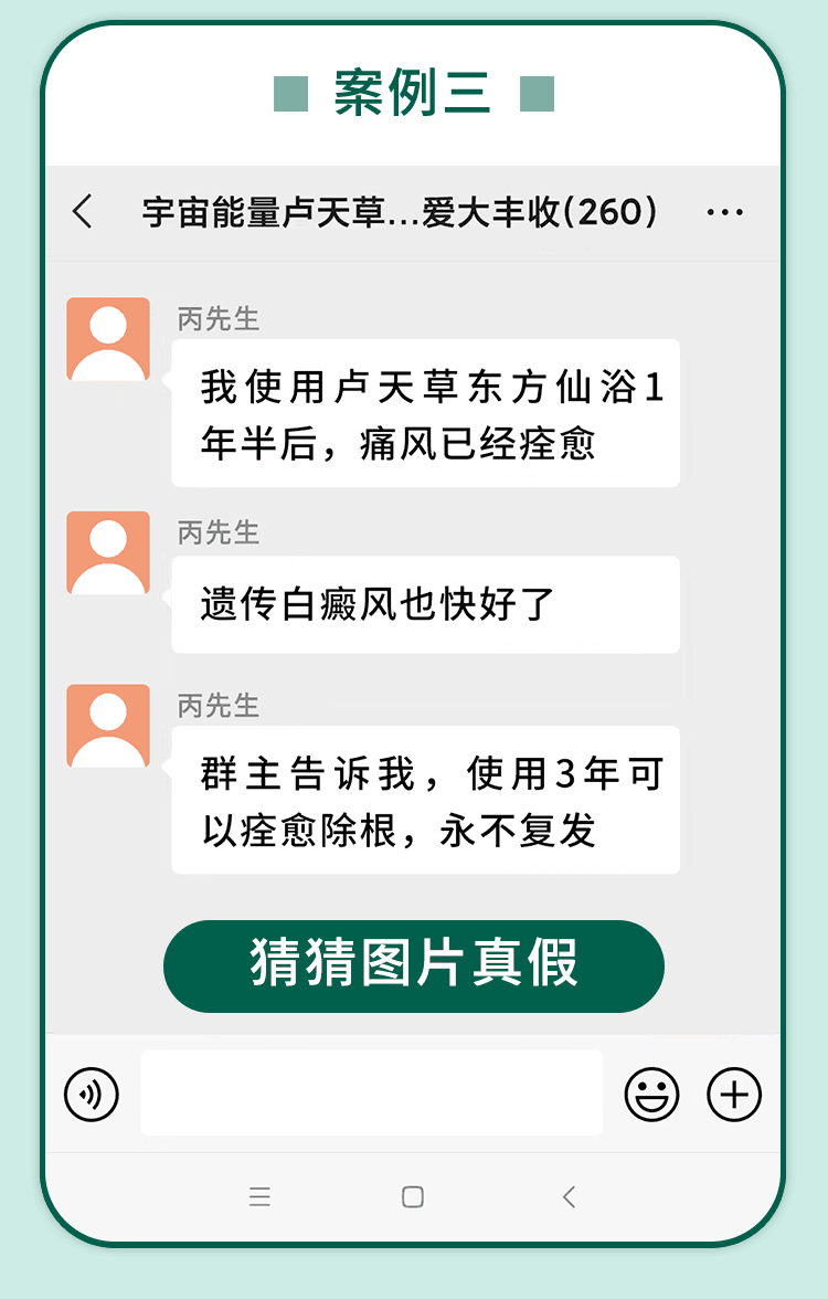 “宇宙能量卢天草八维能量爱大丰收”微信群里那些滚动发布的所谓治愈案例是真是假?对此,小李说:“绝对都是托。我们做实体店时也会采取类似的手段,让那些热衷购买保健品的人现身说法,他们对保健品有一种近乎狂热的迷恋,只要我们提出需求并许诺好处,他们就会帮忙宣传。”