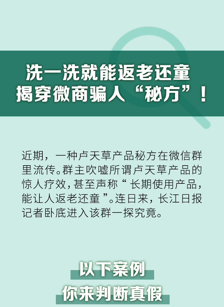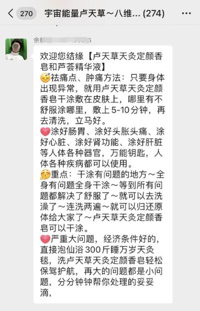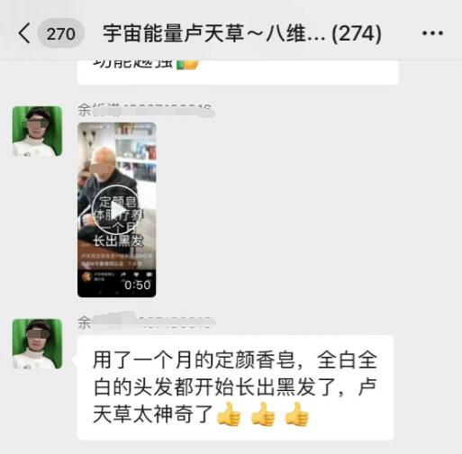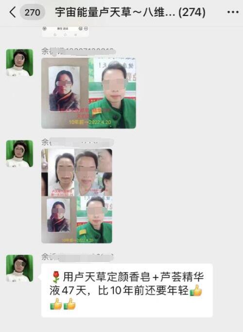 长江日报大武汉客户端5月5日讯(记者赵家新)近日,有网友通过武汉城市留言板反映,自己的朋友加入了一个名为“宇宙能量卢天草八维能量爱大丰收”的微信群里。这个270多人的群里,群主不断吹嘘所谓卢天草产品的惊人疗效,甚至声称“长期使用产品,能让人返老还童”“已经有上万例癌症病人用了卢天草产品后都好了”……