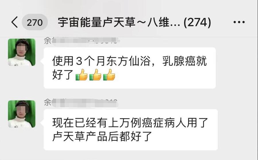 群里,“余老师”甚至宣称:“已经有上万例癌症病人用了卢天草产品后都好了。”