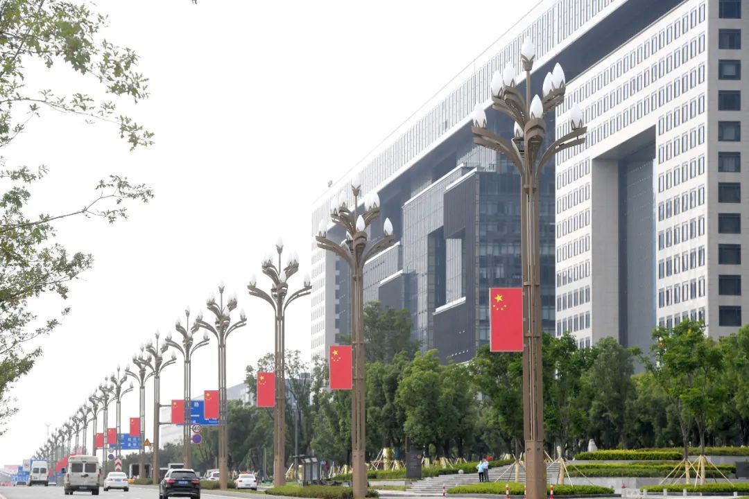 鲜艳的五星红旗悬挂在路灯杆上