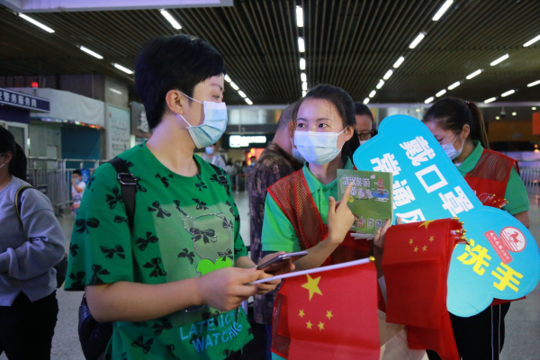 武汉文旅志愿者在武昌火车站为外地游客提供信息咨询、文旅旅游宣传等志愿服务。