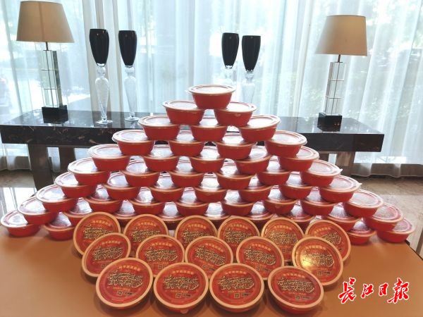 光谷金盾大酒店大堂摆上送给外地游客的热干面。通讯员徐敏 摄