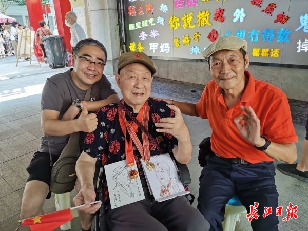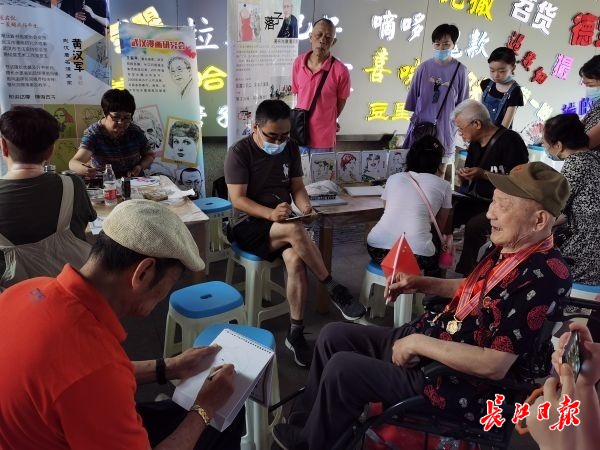 家住唐家墩的汪寿来老人是由孙辈推着轮椅陪同来吉庆街的,孙子说,他就是要走走看看,回顾老武汉,还要去老汉口火车站,那是当年出发的地方。老人精神矍铄,执意要从轮椅上站起来,伸出双手比画着9和3的手势:“我是1951年入朝的,参加了武胜山战役……”他告诉老画家周彤,一定要画出他胸前的奖章。