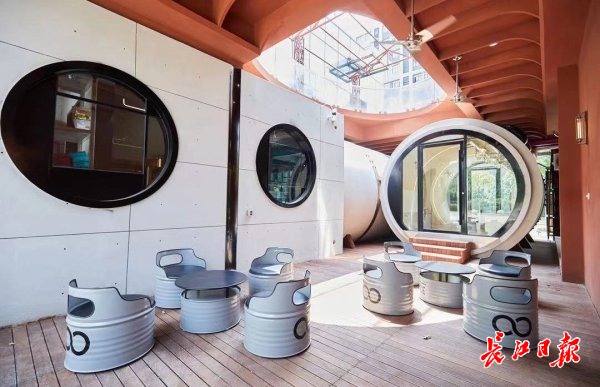长江日报大武汉客户端10月3日讯 3日下午,记者在光谷医疗器械园看到,一家名为“贰筒”的奶茶店吸引了园区加班的年青人来打卡。店如其名,这家奶茶店开在两个直径约3米的巨大水泥筒内,中间有门洞相连,形似《魔戒》中的霍比特人洞穴,却带着简洁现代的工业风格。