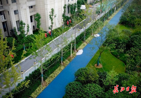 10月3日上午,长江日报记者来到临江大道与园林路交会处的施工现场,只见4米宽的透水混凝土步行道两旁,约10米高的银杏树正在“打点滴”,施工方苏州园林公司正抢抓景观绿化施工黄金时间。绿化带里,金边麦冬草色泽明亮,翠芦莉开着紫色的花。路灯与步行道边沿铺设的装饰性铁轨颜色一致,透露出历史感,展示一条铁路文明与园林生态交织的风景线。