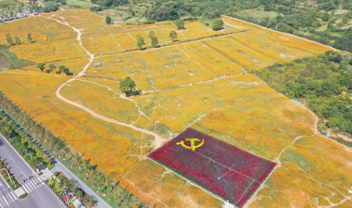 光谷政务服务中心附近的光谷西苑公园,14万平方米的硫华菊,橙色小花密密地开在起伏的山坡上,像极了一幅油画。在摄影师童汉芳的无人机航拍视角下,巨大的花毯铺满大地,非常壮美。