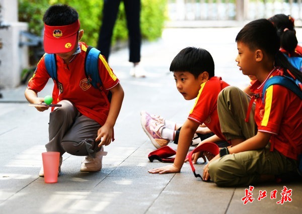 园博园景点,几位小朋友正在比试投乒乓球看谁投得准。