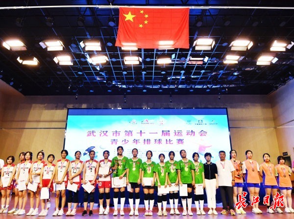武汉第十一届运动会青少年排球比赛在江夏区实验高中举行。图为获奖选手站在国旗下合影。
