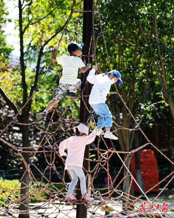 园博园景点,三位小朋友正在攀爬障碍网,女生胆识不输男生。