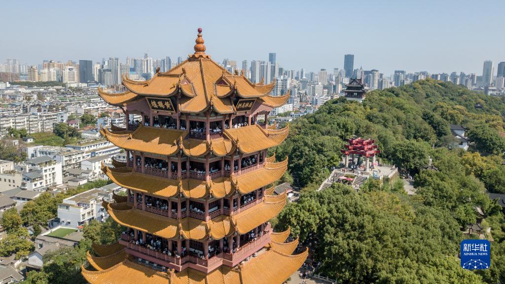 10月5日,游客登上黄鹤楼观光游览(无人机照片)。新华社发(伍志尊 摄)