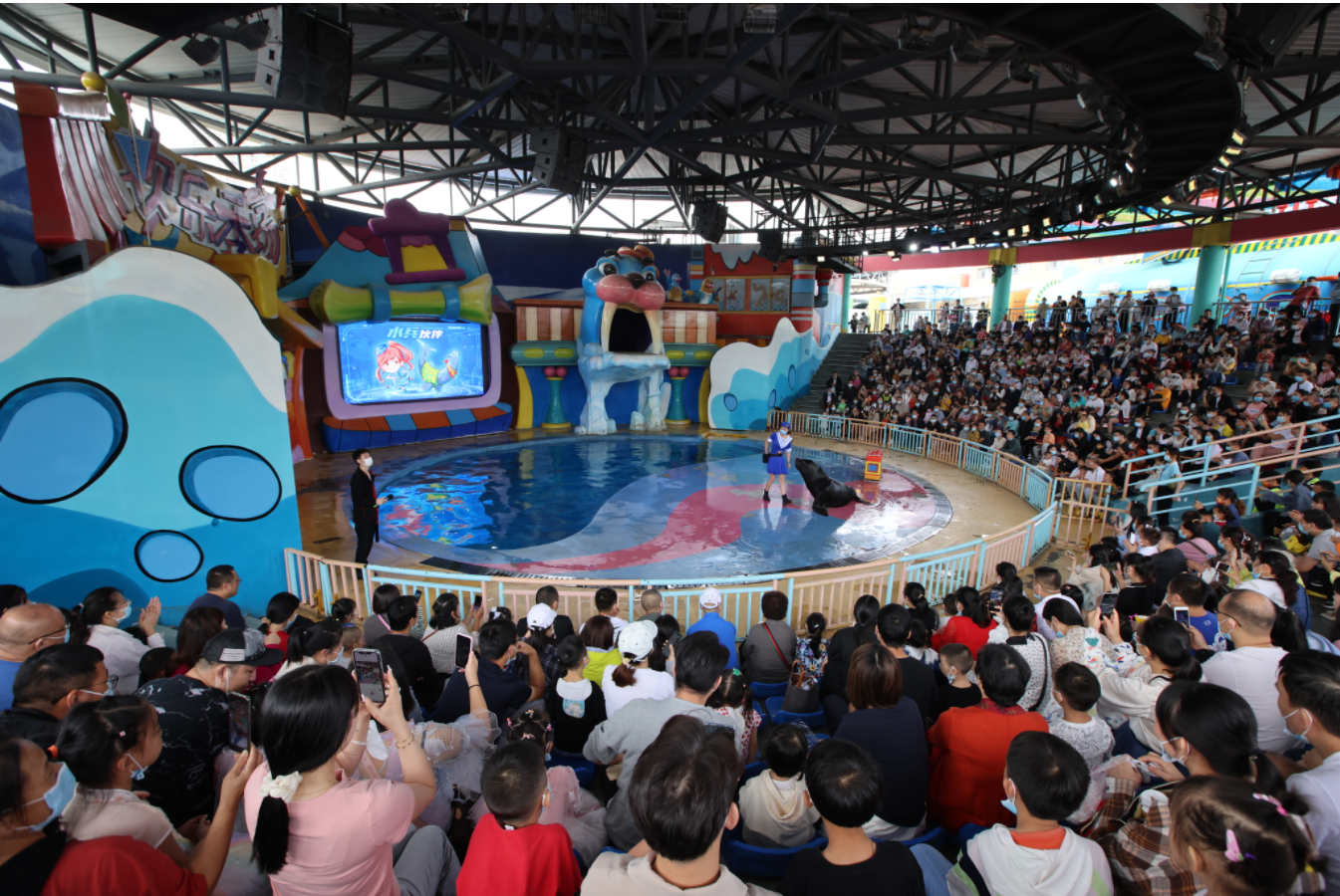 小剧场里坐得满满当当,一座难求,海豹海狮表演赢得家长和孩子们的阵阵掌声。