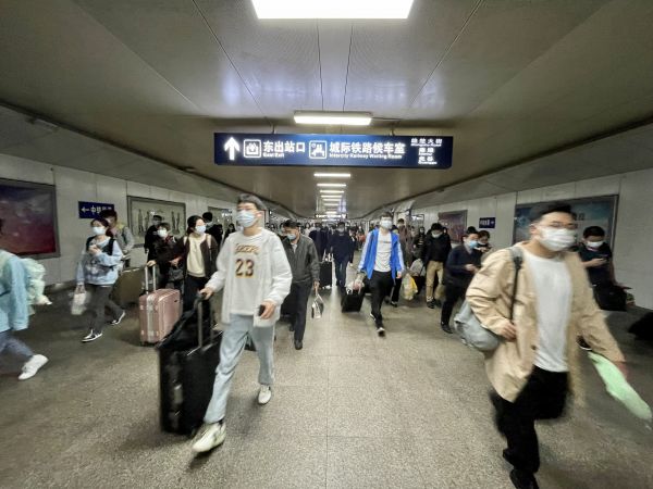 武昌火车站迎来返程客流高峰,出站口排起长队,旅客自觉佩戴口罩,有序出行。从下午2时开始,武昌雄楚大道高架桥上的来往车辆逐渐增多,行车缓慢,从光谷方向进城的返城车队明显多一些。