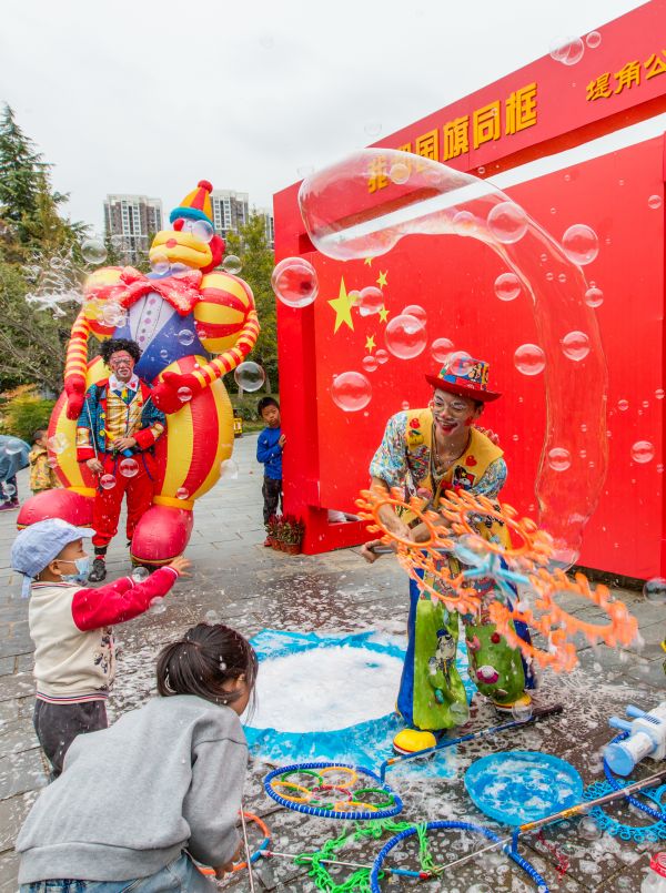 堤角公园举行了“小丑嘉年华,低碳我最行”巡游互动活动,深受游客特别是小朋友的喜欢,孩子们围在小丑身边,看小丑用各种工具挥舞出一串串大泡泡,一个个笑得合不拢嘴。