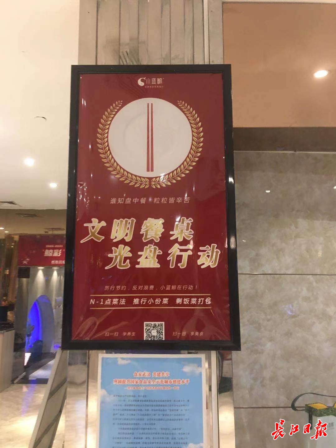 在小蓝鲸餐厅,随处可见“文明餐桌光盘行动”的提示语。记者黄丽娟 摄(资料图)