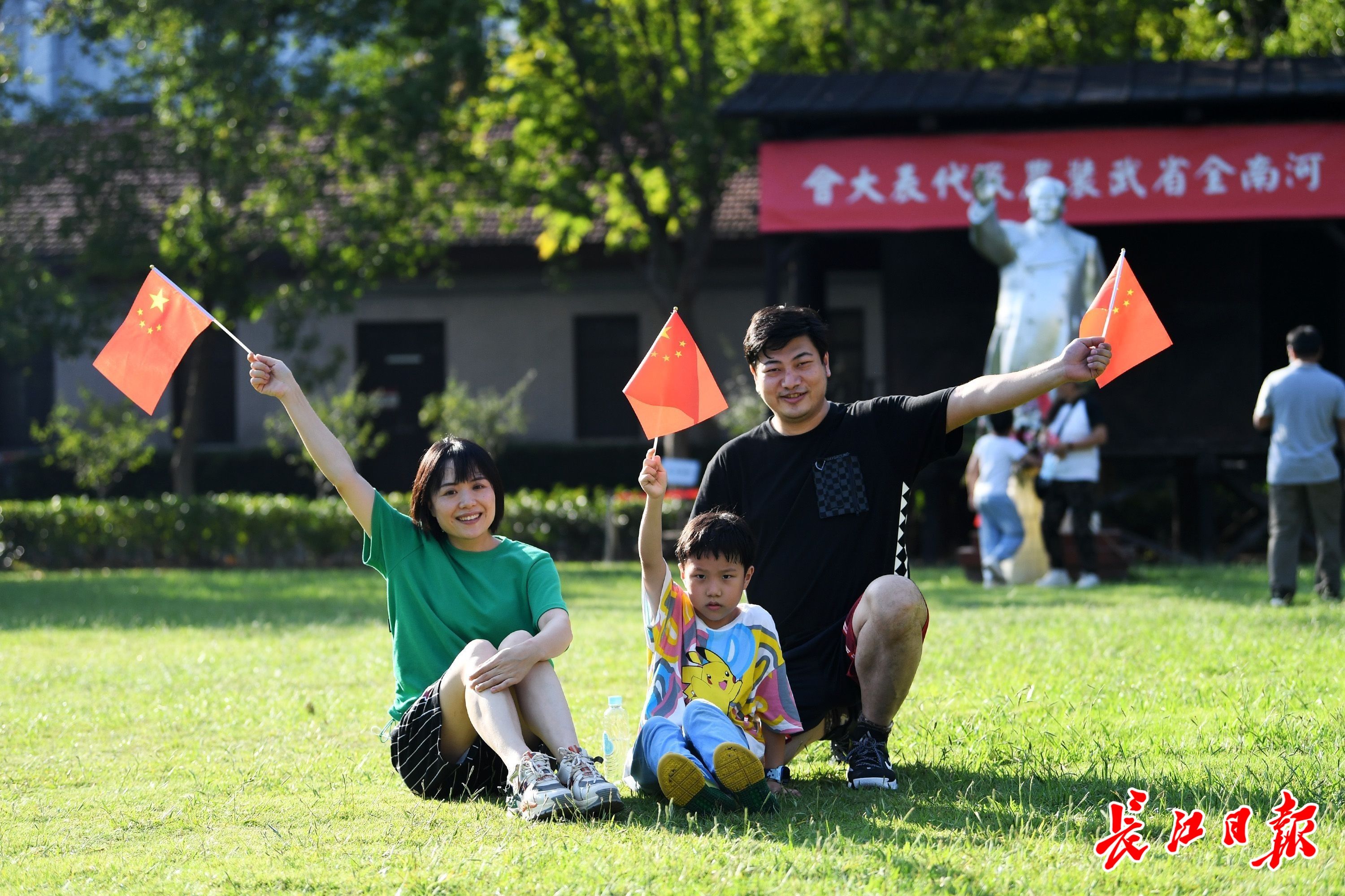 国庆假期,一家三口参观武昌中央农民运动讲习所旧址后舞动国旗拍照留影。记者史伟 摄