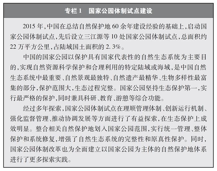 中国不断推进自然保护地建设,启动国家公园体制试点,构建以国家公园为主体的自然保护地体系,率先在国际上提出和实施生态保护红线制度,明确了生物多样性保护优先区域,保护了重要自然生态系统和生物资源,在维护重要物种栖息地方面发挥了积极作用。