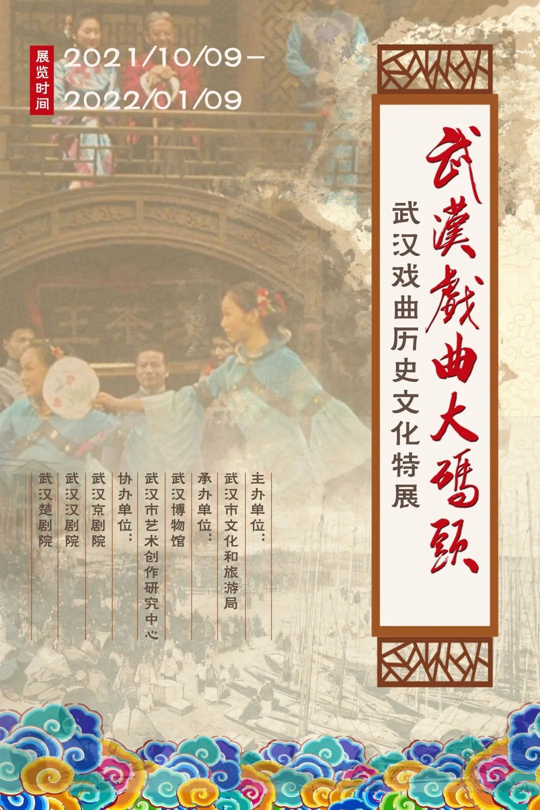 为弘扬武汉戏曲文化艺术,2021年10月9日,由武汉市文化和旅游局主办,武汉博物馆、武汉市艺术创作研究中心承办,武汉京剧院、武汉汉剧院和武汉楚剧院协办的“武汉戏曲大码头——武汉戏曲历史文化特展”在武汉博物馆开展。展览将持续至2022年1月9日。