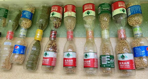 用塑料瓶、豆米自制的运动器械。通讯员余少芹 摄