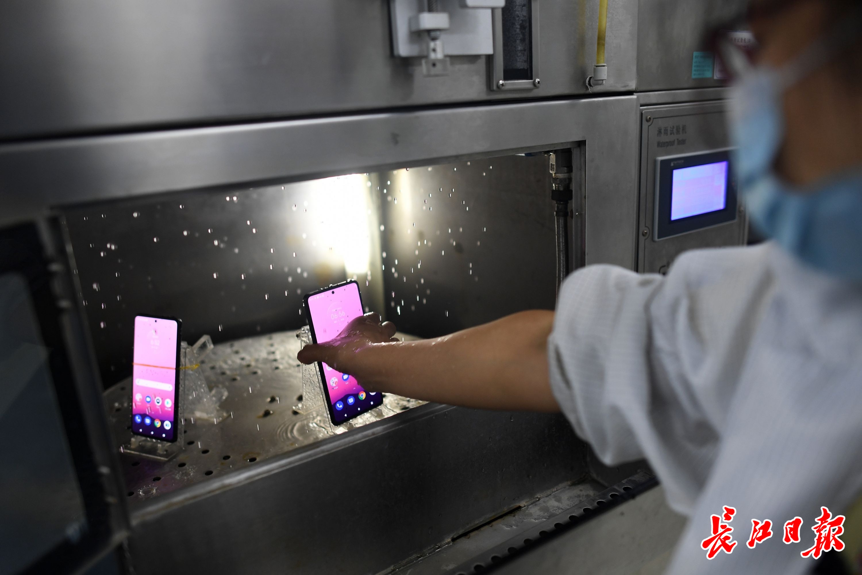 联想生产的摩托罗拉手机在进行防水测试,手机在10分钟淋雨环境下能保持正常工作状态。长江日报记者周超 摄(信息来源:通讯员何璇)